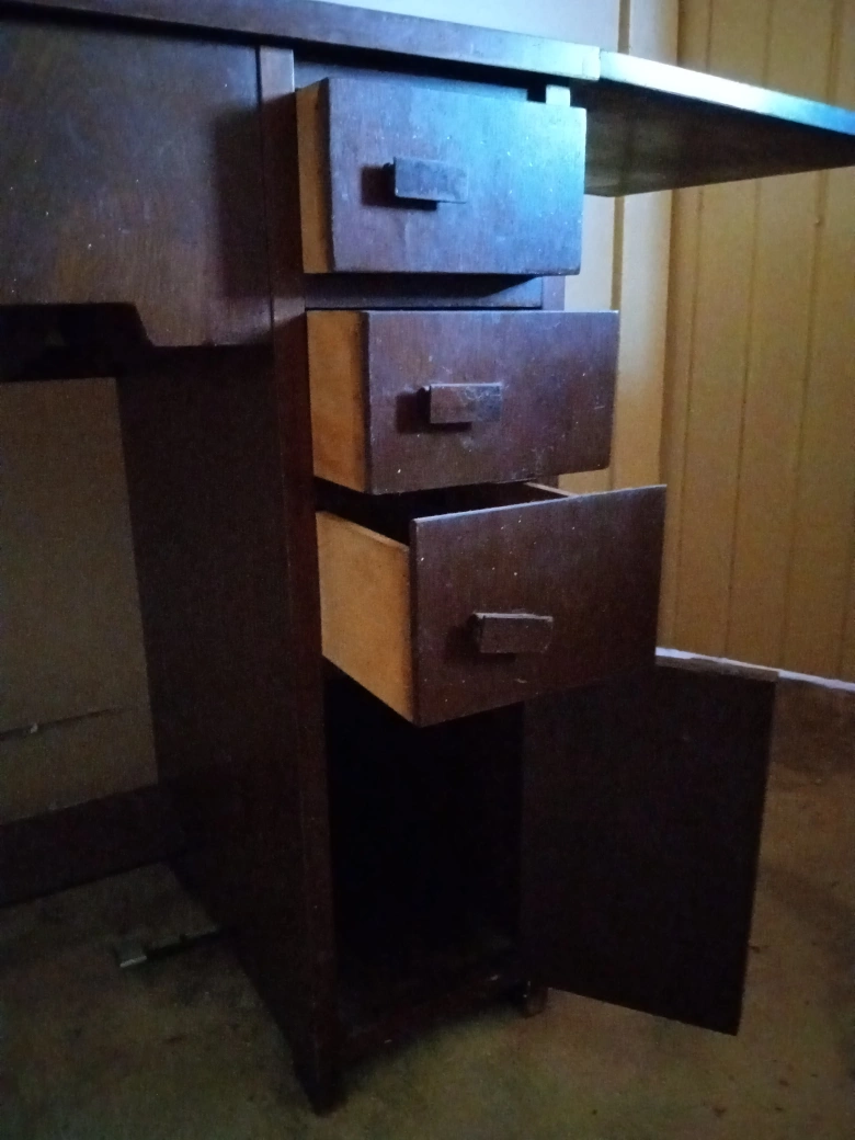 Selling a vintage sewing table desk. It has a flip top and several drawers for storage. It's a unique piece that would be great for a sewing enthusiast or as a decorative desk