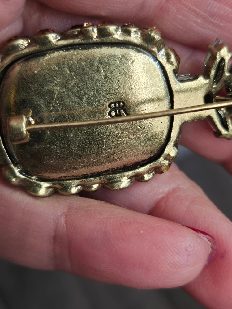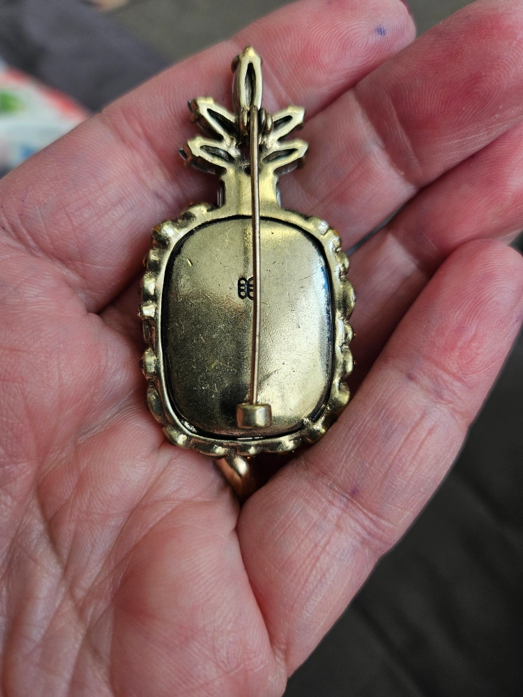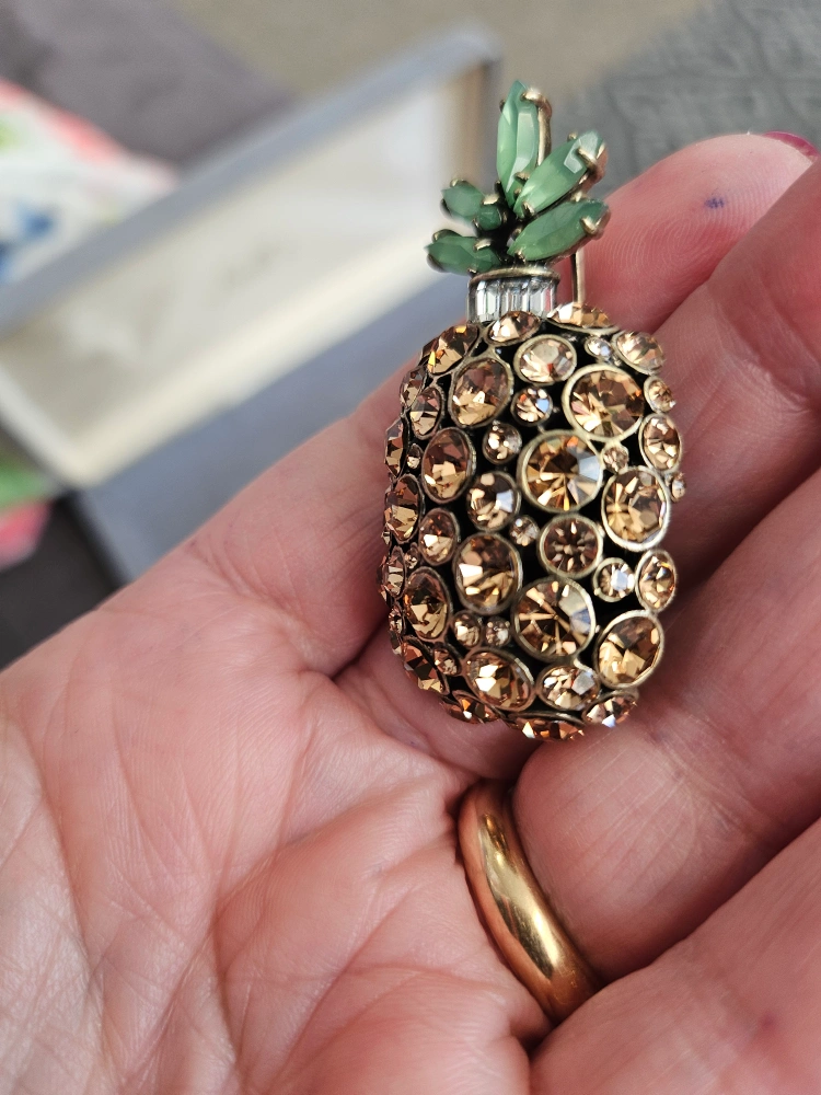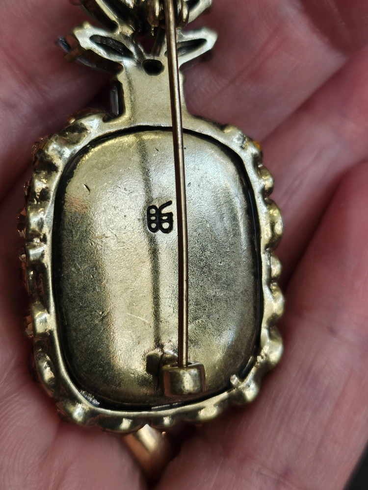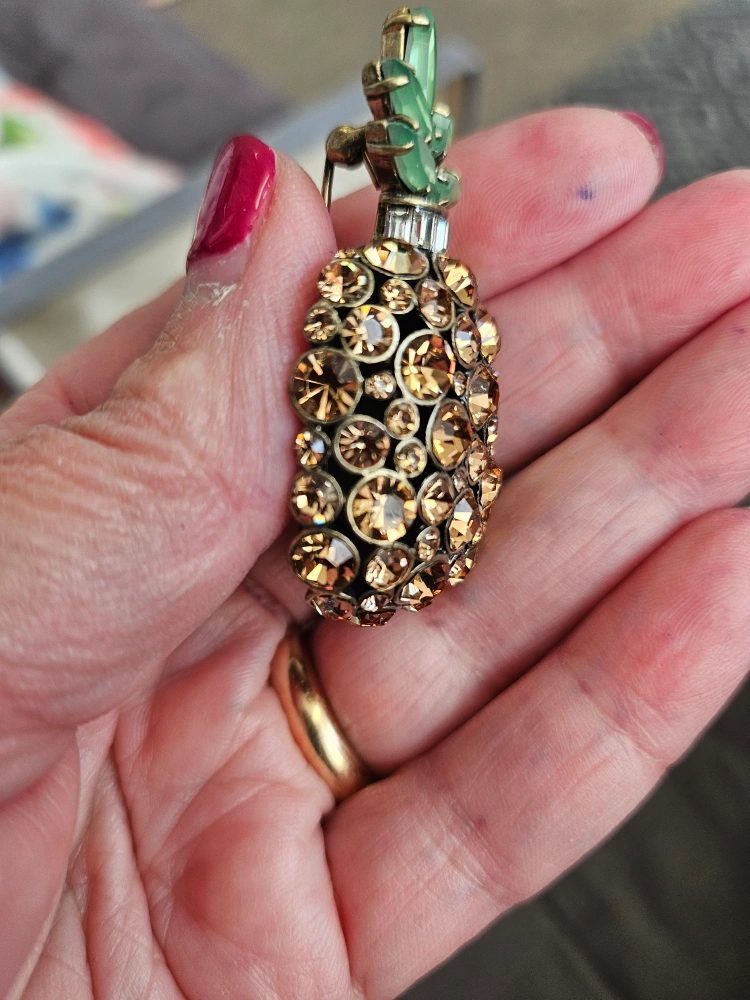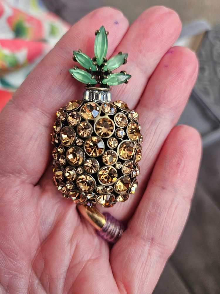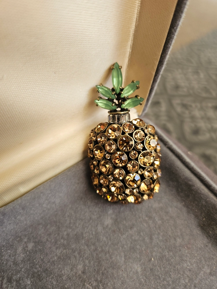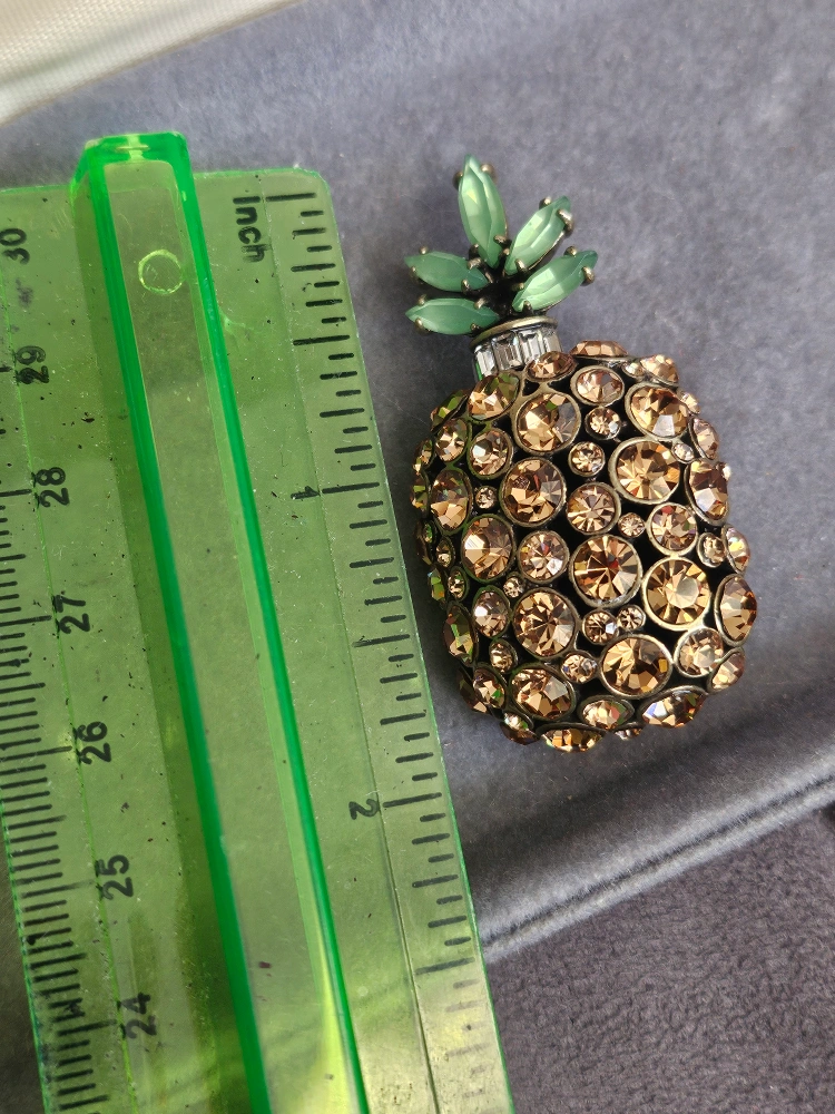 21This is a pineapple-shaped brooch covered in rhinestones. It has green rhinestones on the top for the leaves and gold rhinestones on the body. It's in great condition by Banana Republic