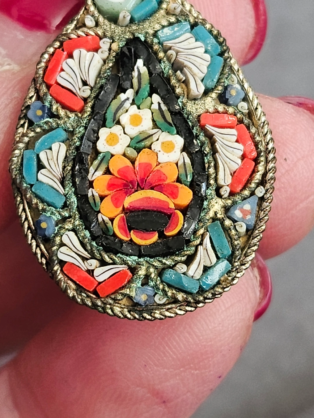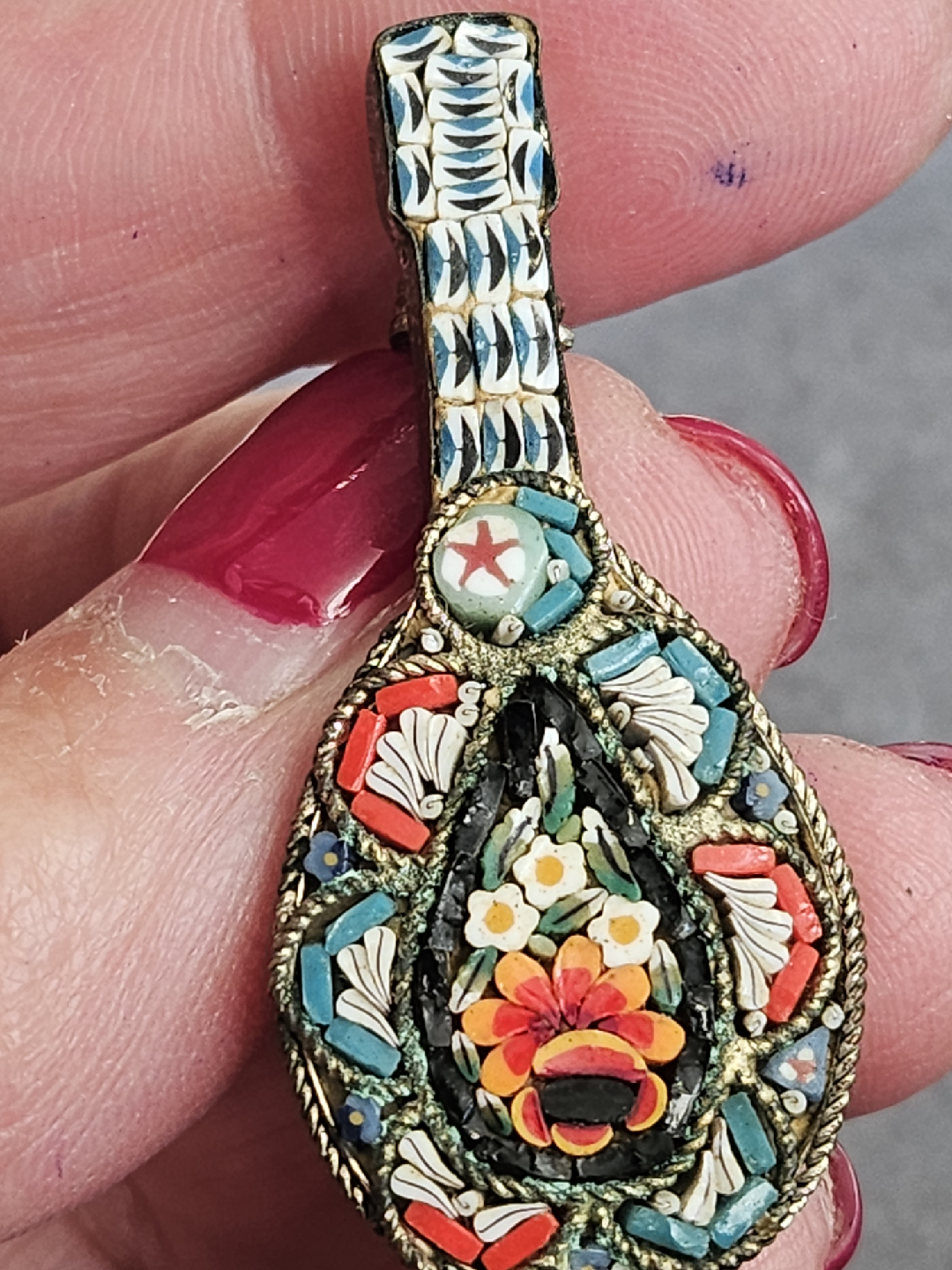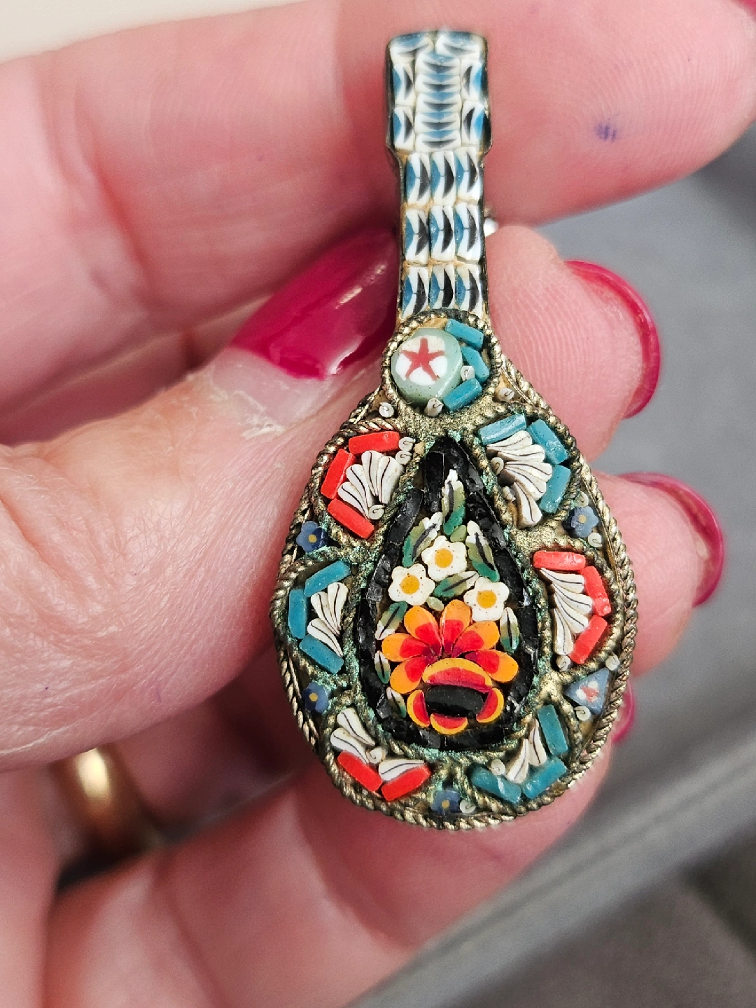 This is a lovely vintage Italian micro mosaic brooch in the shape of a mandolin. It features a beautiful floral design with vibrant colours. A unique piece of wearable art!