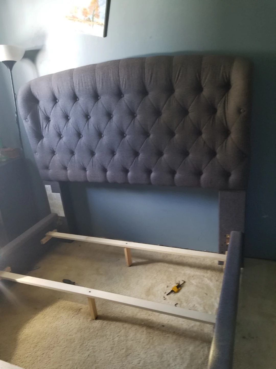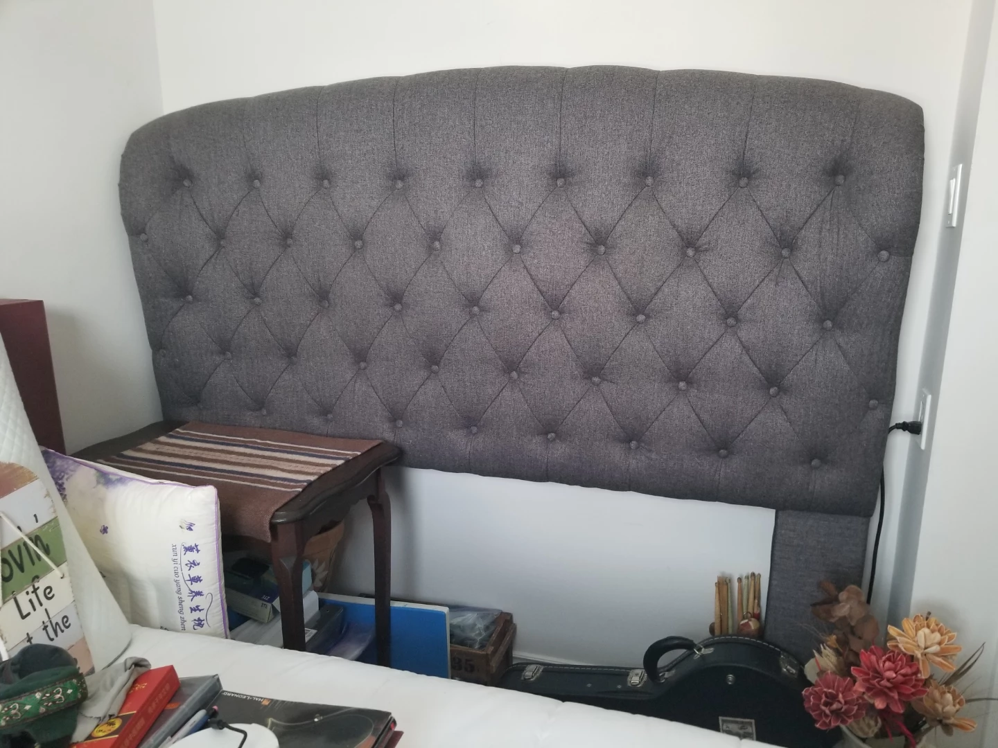 A beautiful queen size, grey tufted upholstered headboard and matching frame, in mint condition. All parts included.