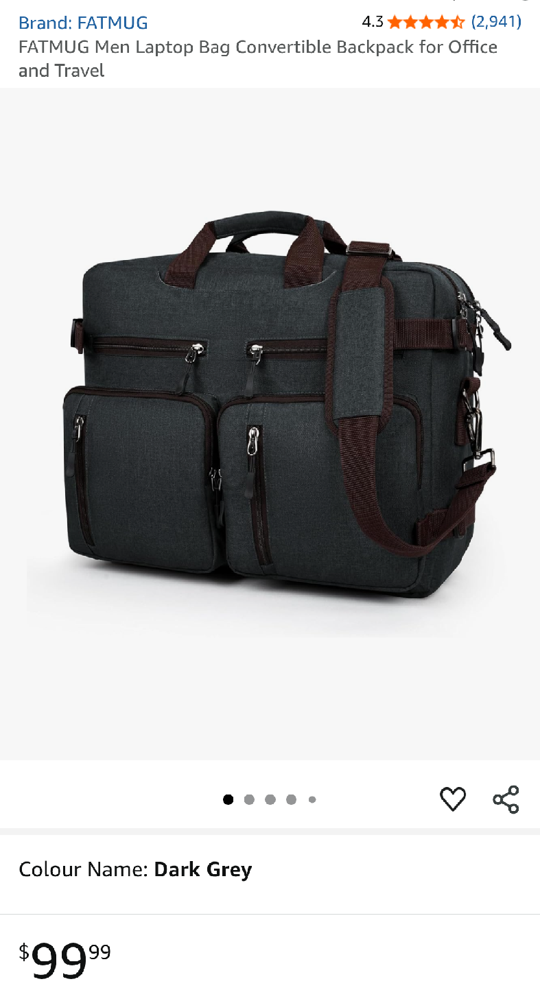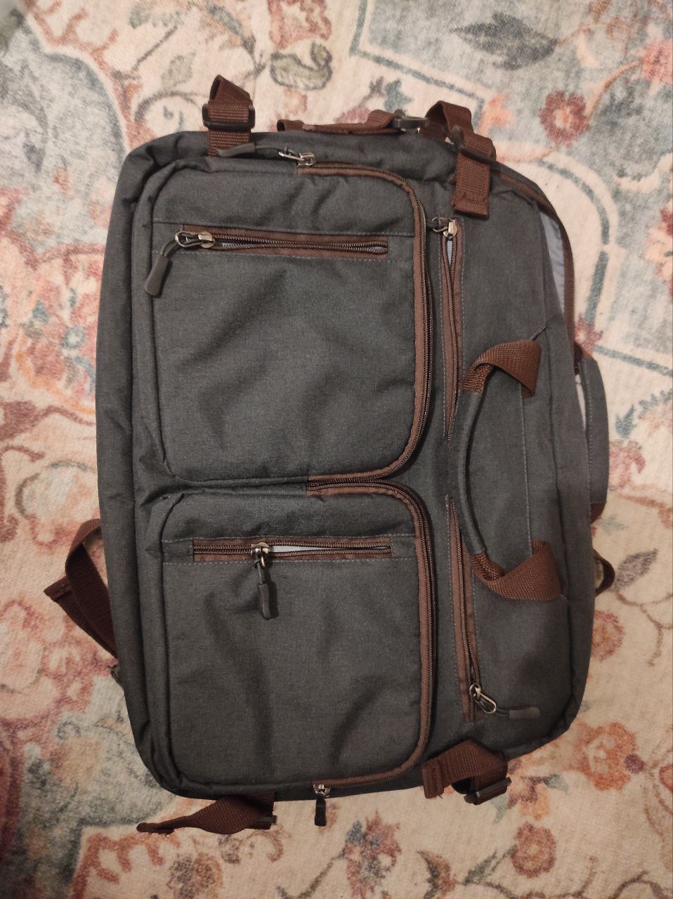 Laptop bag that can also convert into a backpack! It's a dark grey colour and in great shape. It's a smart design for work, travel, and everyday use.