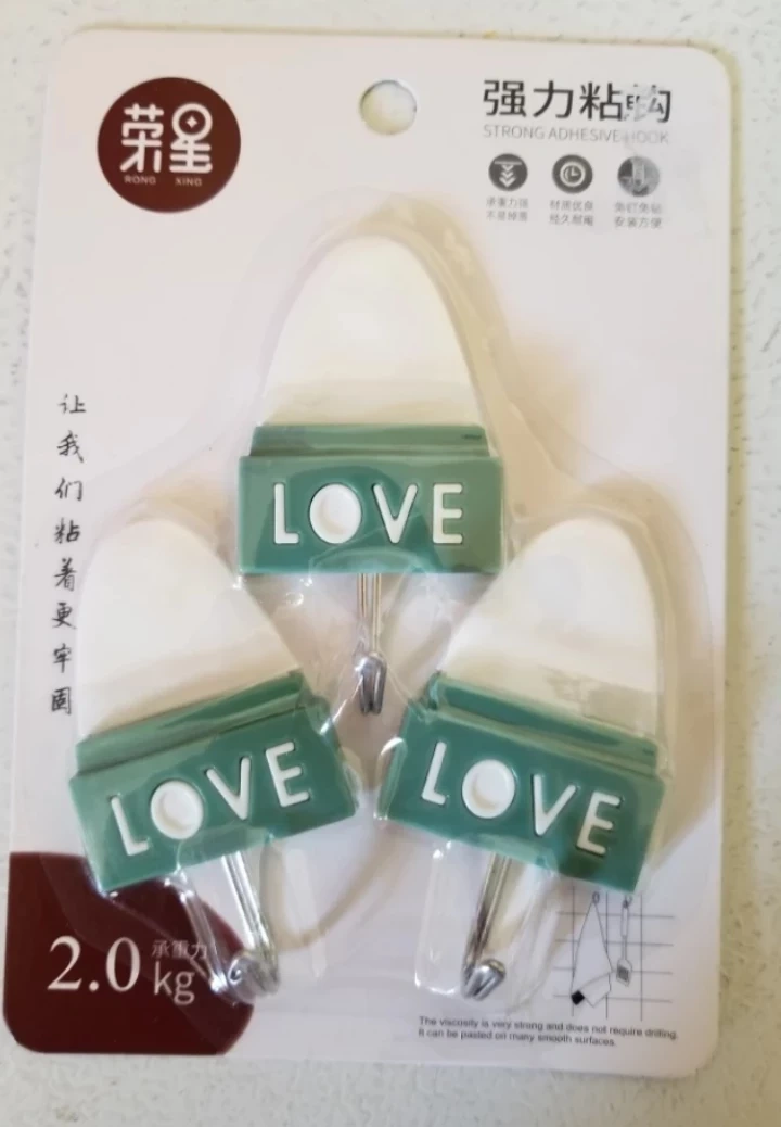 A set of three Yong Xing adhesive hooks, brand new in packaging! They each have the word 'LOVE' on them in white letters, making them a cute addition to any room. They're a strong adhesive hook.
