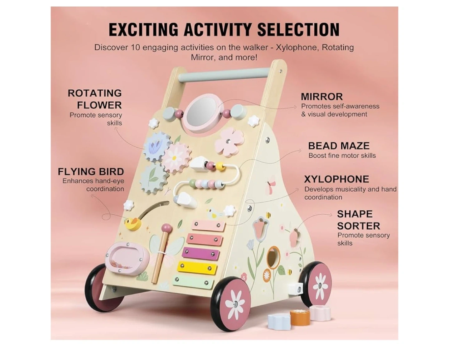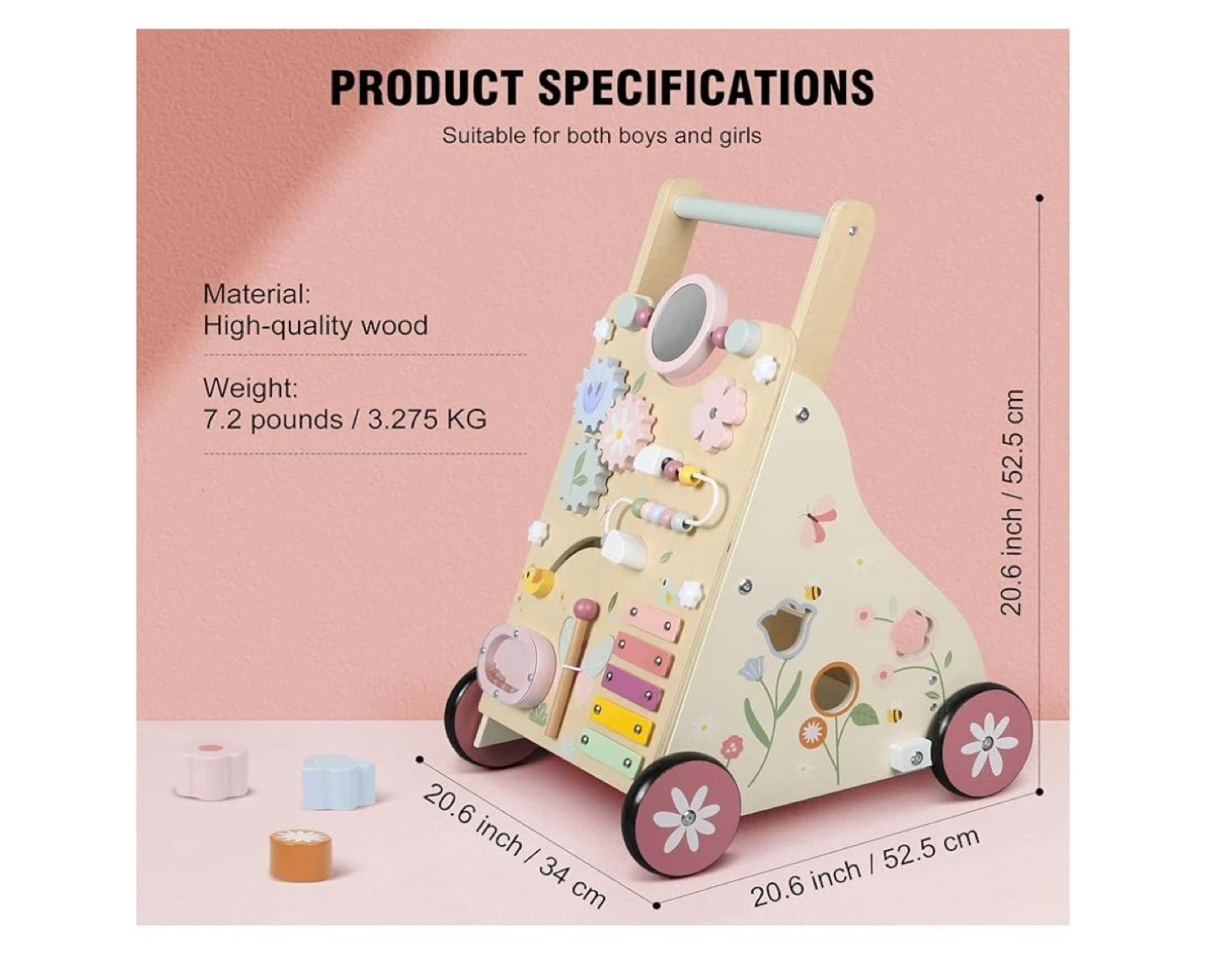 It features a variety of engaging activities, including a rotating flower, mirror, bead maze, xylophone, and shape sorter. These activities help develop fine motor skills, hand-eye coordination, and problem-solving skills. The walker weighs 7.2 pounds and measures 20.6 inches in height and width.