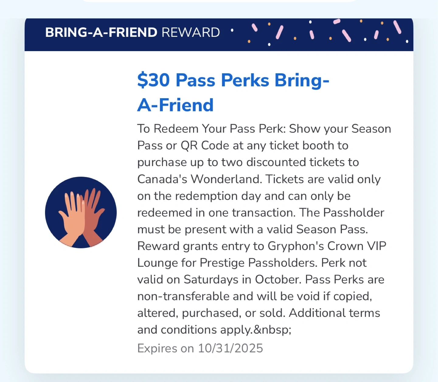 I have a Canada's Wonderland Bring-A-Friend pass $30 perk available! It allows you to purchase up to two discounted tickets at any ticket booth by showing your Season Pass or QR Code