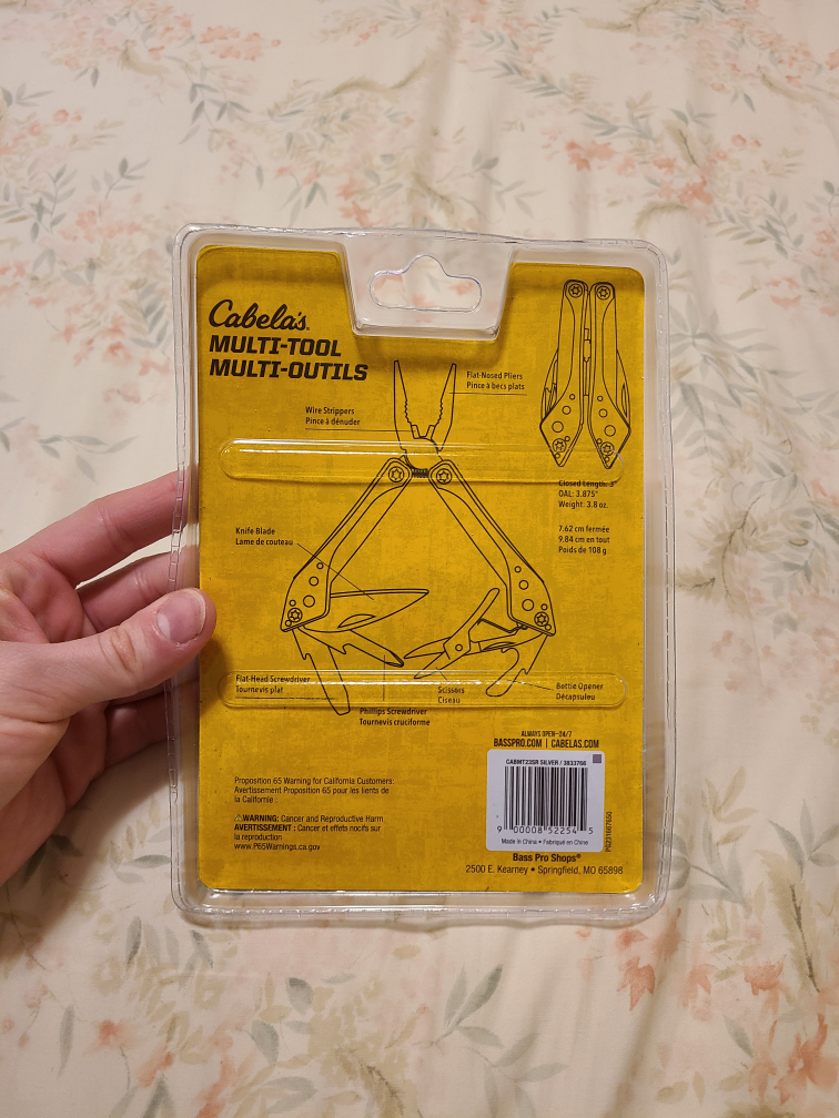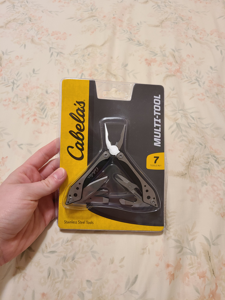 Brand new Cabela's Multi-Tool, still sealed in its original packaging. Includes 7 different functions: Flat nosed pliers, wire strippers, knife blade, flat head screwdriver, Phillips screwdriver, scissors and bottle opener.