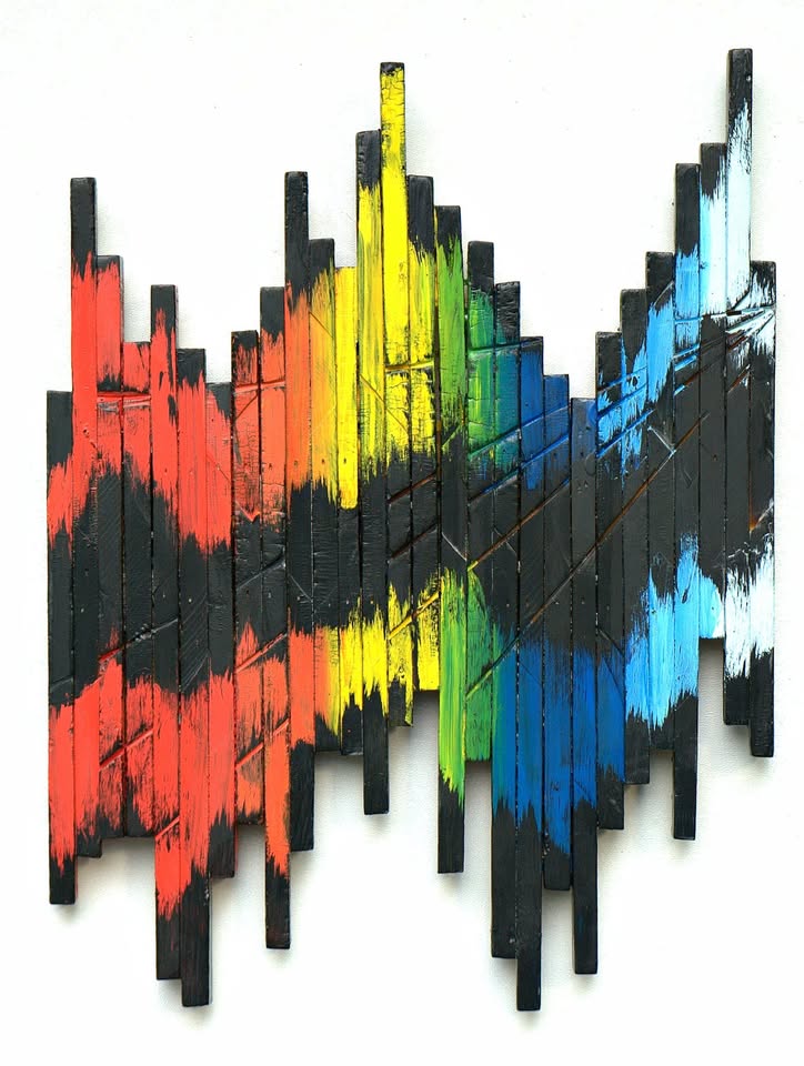 Each bundle of wood strips takes about 1 hour to dismantle and plane down to revel it's inner beauty, then it is cut down to size. Each strip yields 4-6 pieces of useable wood that I arrange, glue and brad nail them down as with the Rainbow version