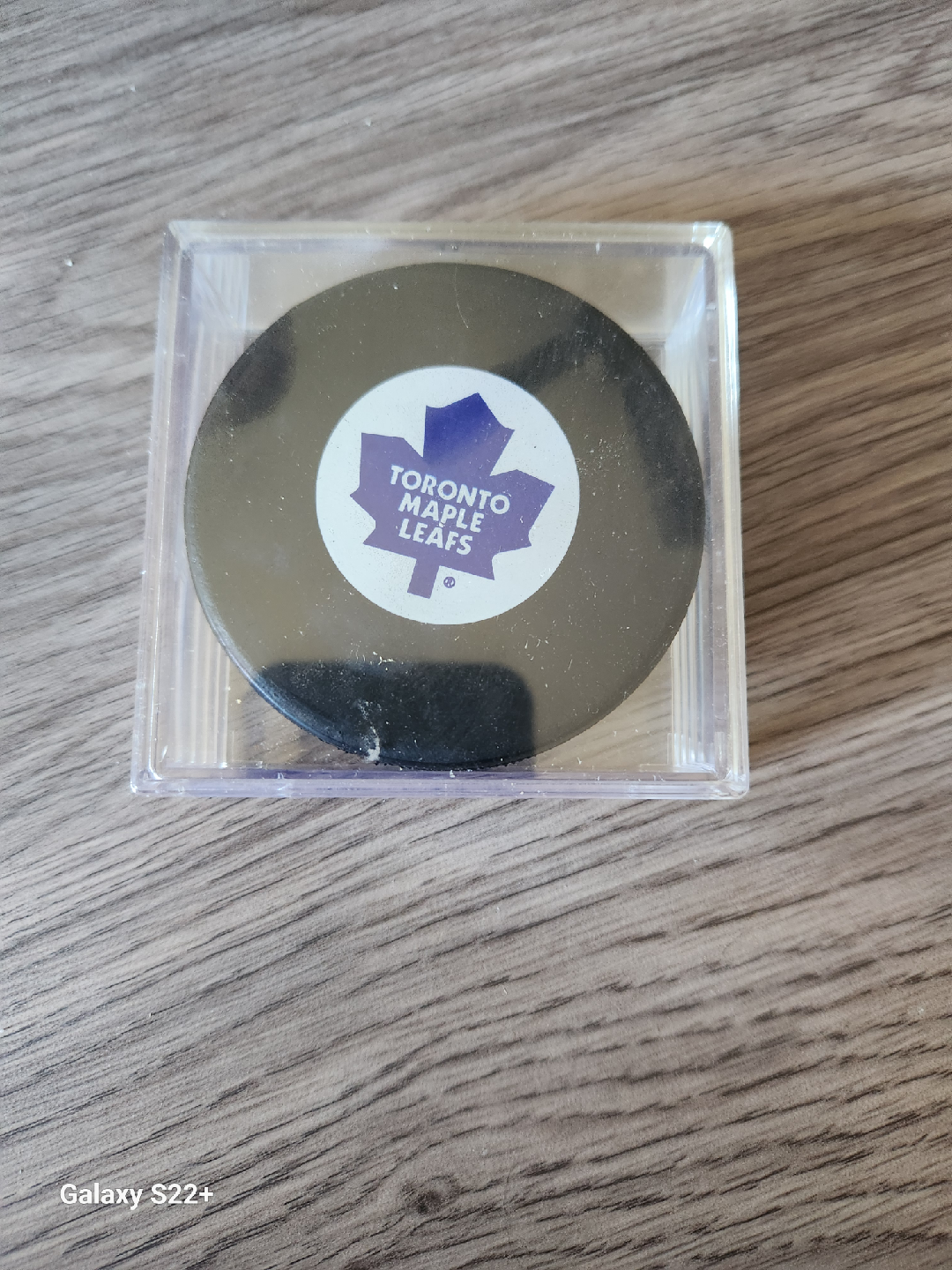 Selling a Toronto Maple Leafs hockey puck, complete with a clear display case. It has a signature on one side. Great for any hockey fan! Autographed by Jay Rosehill #38 and John Mitchell #39