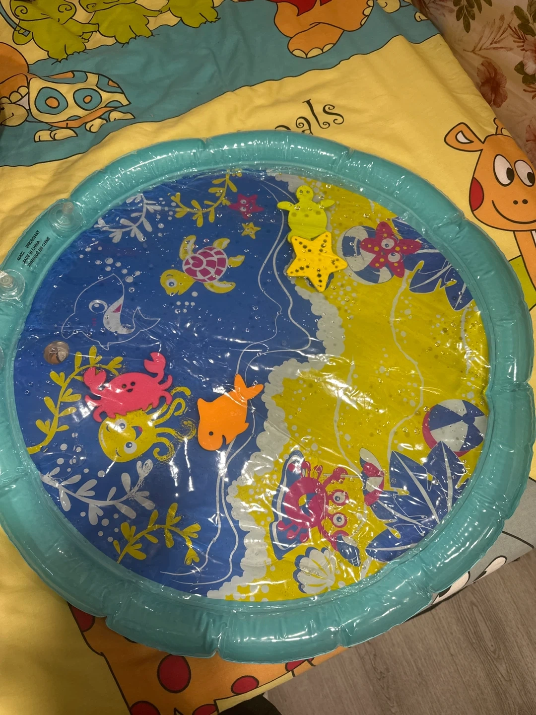This is an inflatable water play mat for babies and toddlers. It's great for tummy time and sensory play! It is made of durable material and is easy to inflate and deflate. The mat features colourful sea animal designs to keep your little one entertained