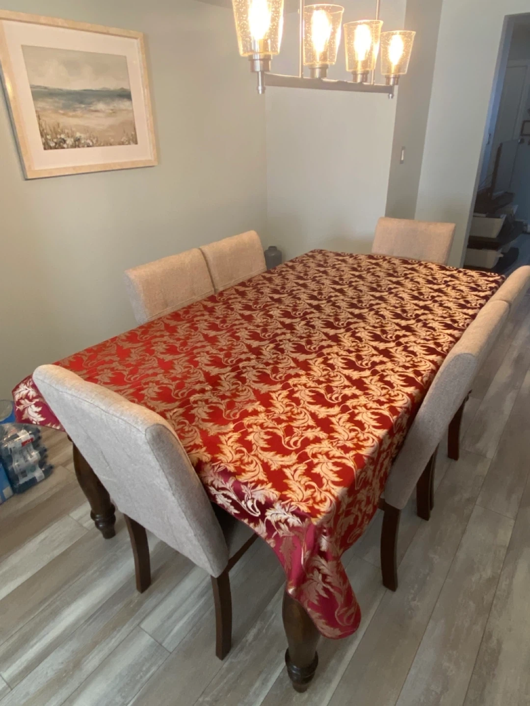 Beautiful burgundy and gold patterned tablecloth, perfect for adding a touch of elegance to your dining room! The intricate design features lovely leaf patterns. It's in great condition and ready to brighten up your table