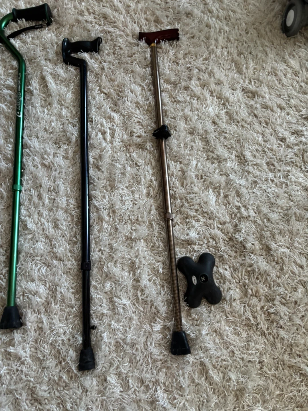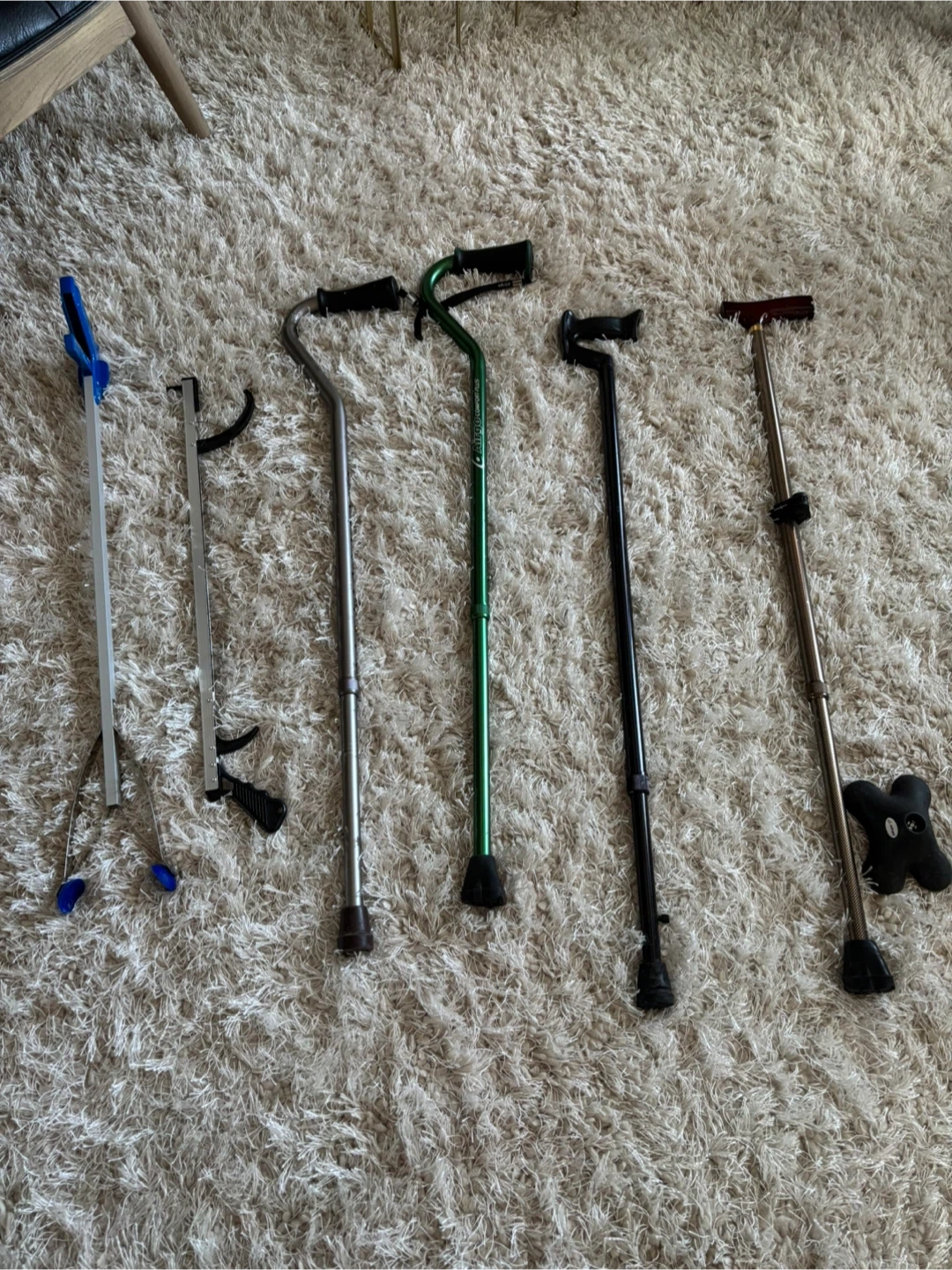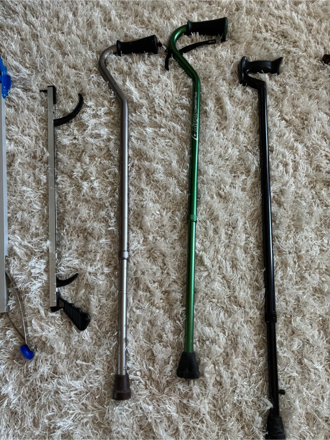 Selling a variety of walking canes. There's a green adjustable cane, a black cane, a silver cane, and one with a brown handle. Also included is a grabber tool. Great for anyone needing a little extra support!