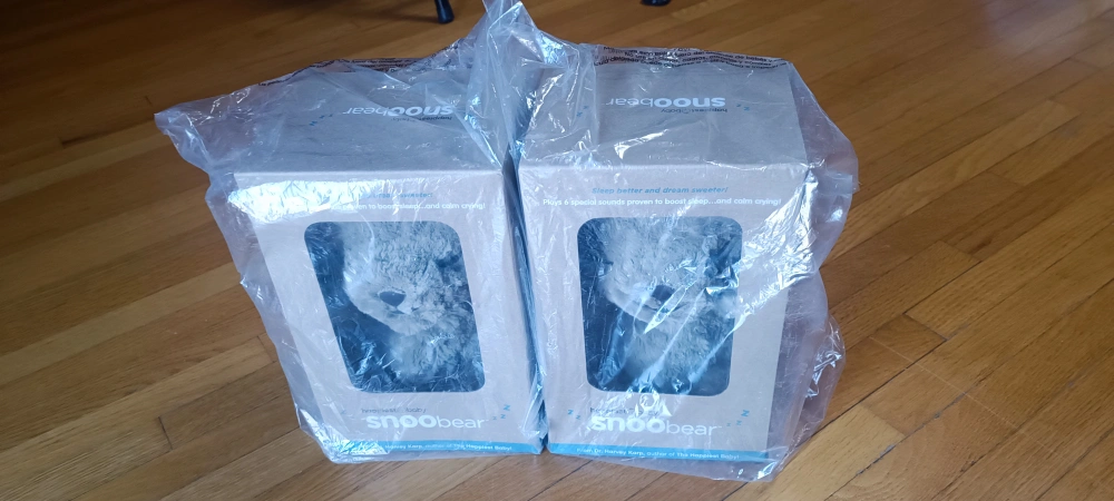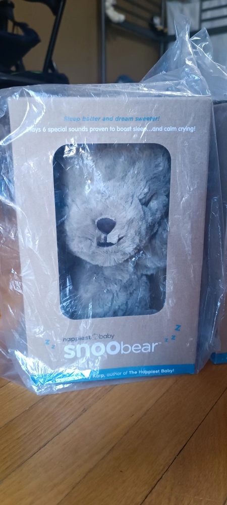 I'm selling 2 brand new Happiest Baby Snoo Bear in Cocoa Plush! It's still in its original packaging and has never been opened. This adorable bear plays 6 special sounds proven to boost sleep and calm crying, so your little one can sleep better and dream sweeter! Perfect for a baby gift!