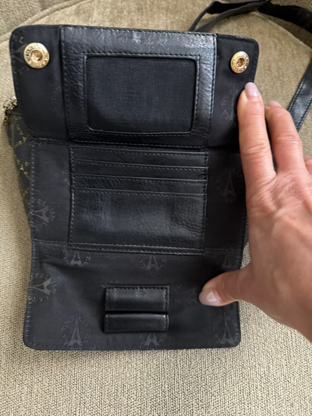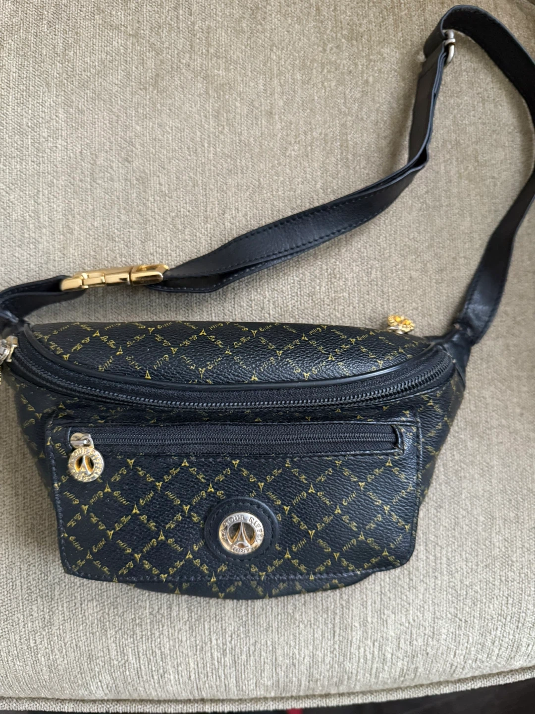 This La Tour Eiffel belt bag is in great condition and ready for a new home! It's black leather with gold-tone hardware and an all-over Eiffel Tower pattern inside and outside. The bag features a zippered main compartment, a front zippered pocket, a back zipper, and an adjustable belt strap. Perfect for keeping your essentials close at hand!
