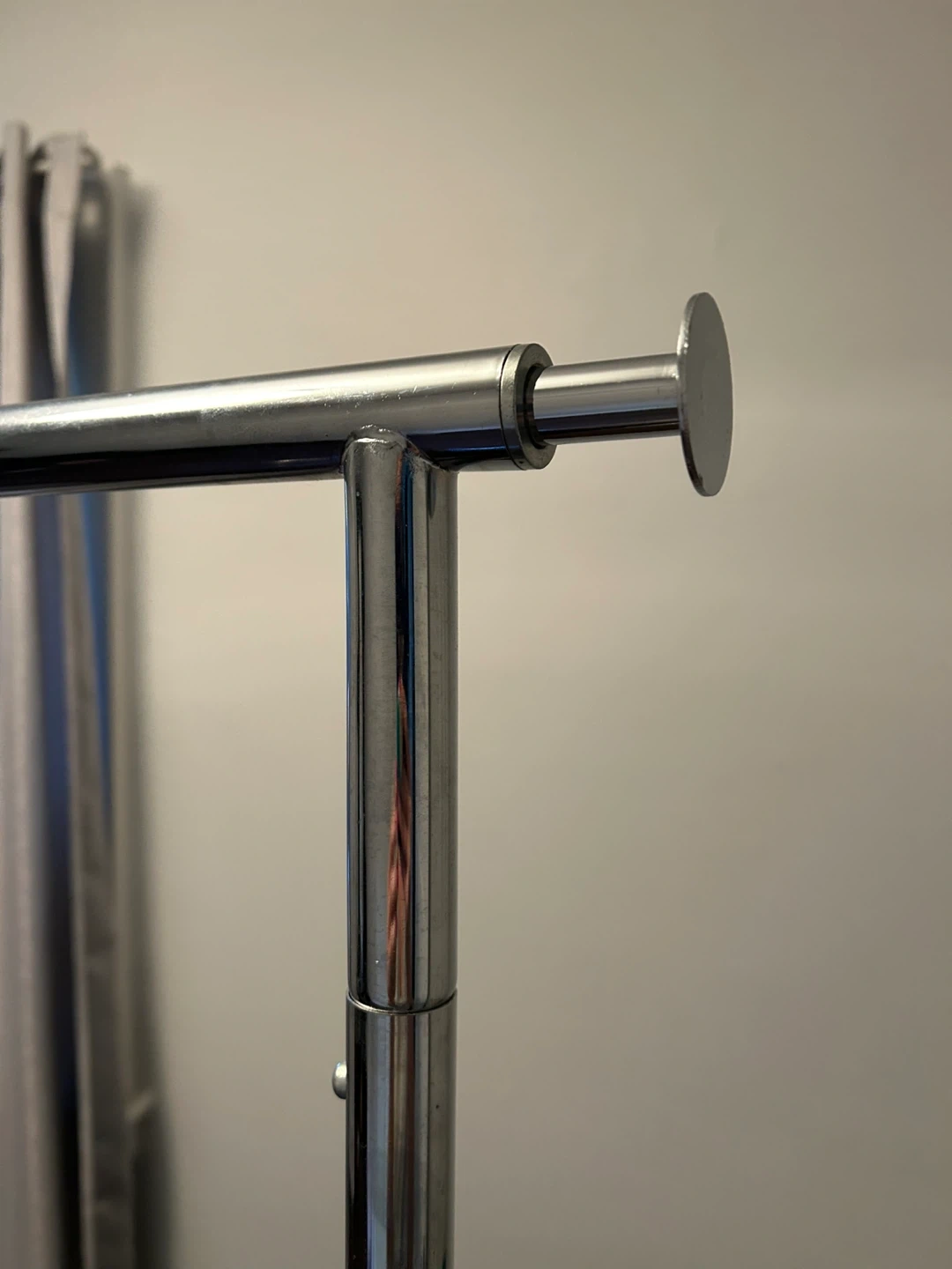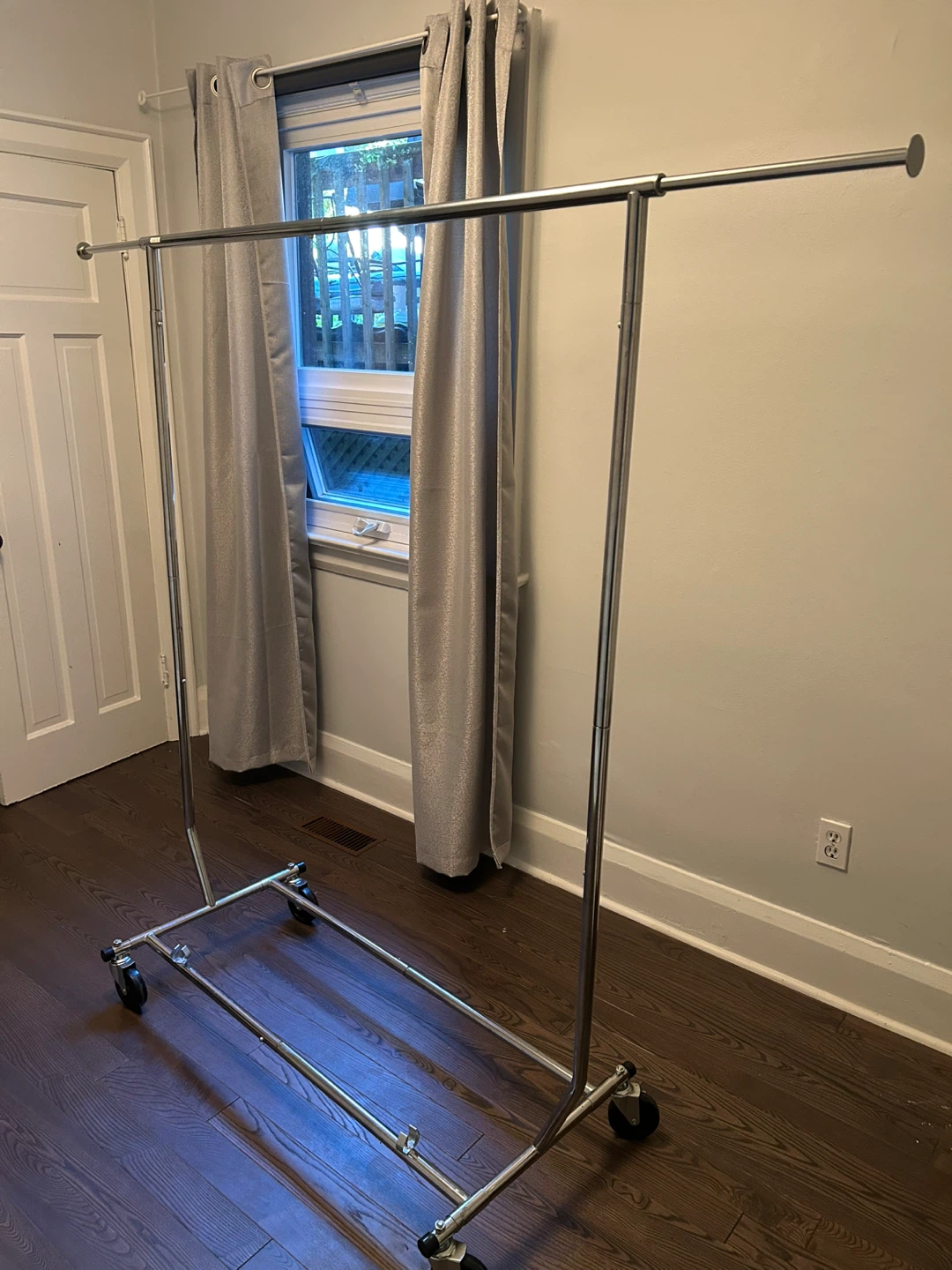 Handy adjustable rolling garment rack! It's perfect for extra closet space or for organizing clothes. Great for hanging clothes to dry. The rack is made of sturdy metal and has wheels for easy moving around. Disassembles easily to be able to fit in car.