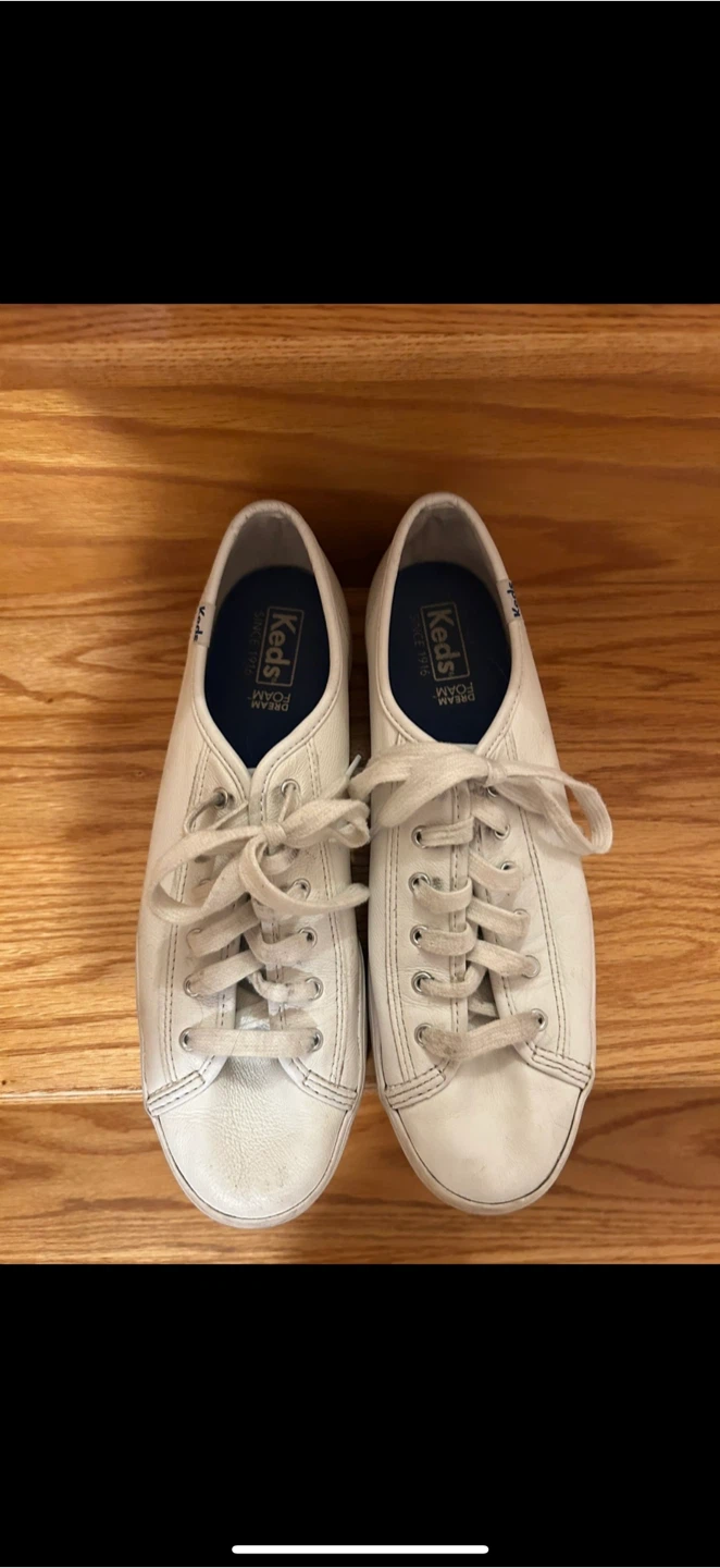 Selling a pair of Keds women's sneakers in size 8.5. They're a classic style in white leather. These have been worn but still have lots of life left in them. Perfect for everyday wear!