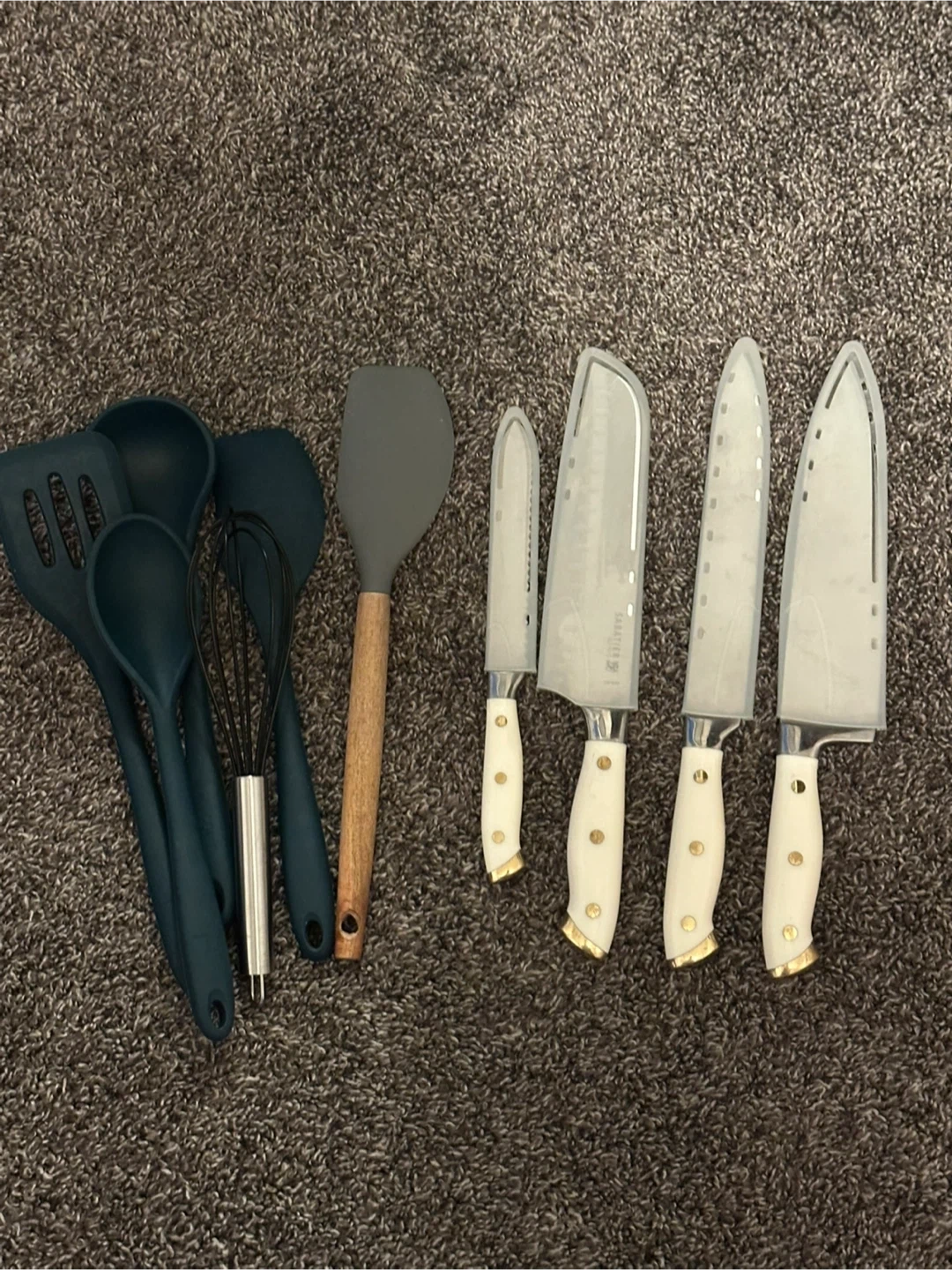 Selling a set of kitchen utensils and knives. The set includes various spoons and spatulas, a whisk, and four knives with white handles. Great for anyone setting up a new kitchen or looking to upgrade their current tools!