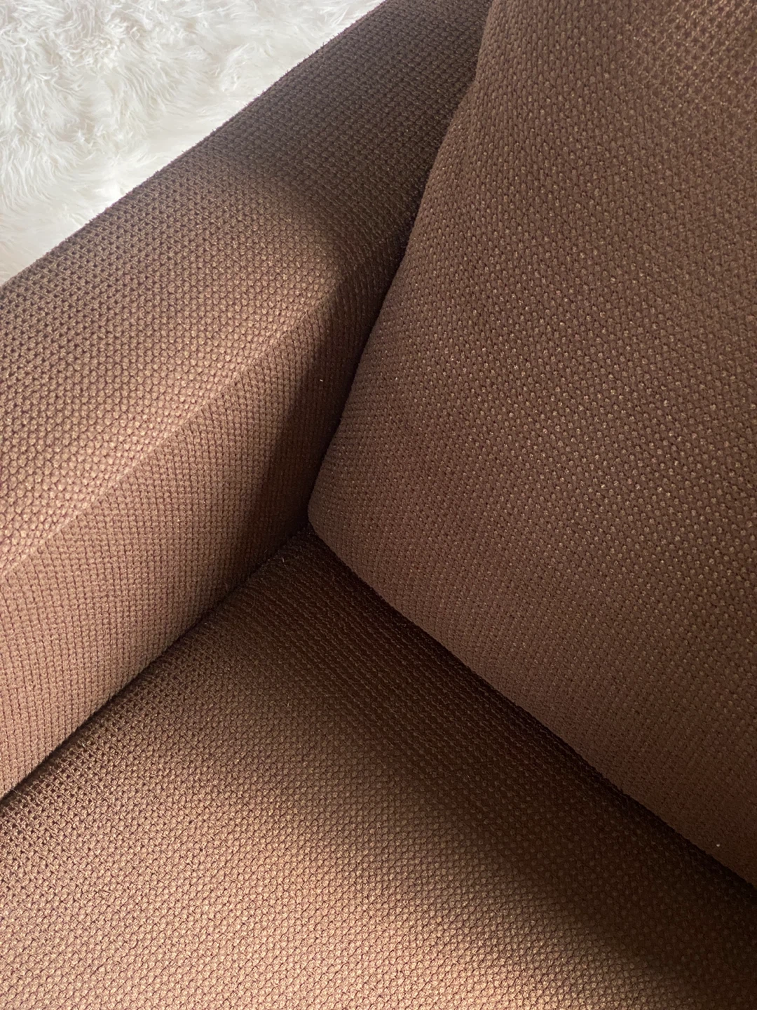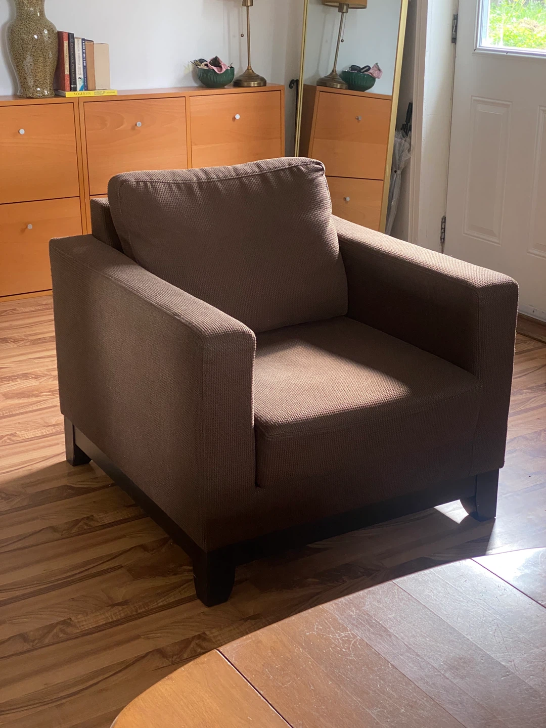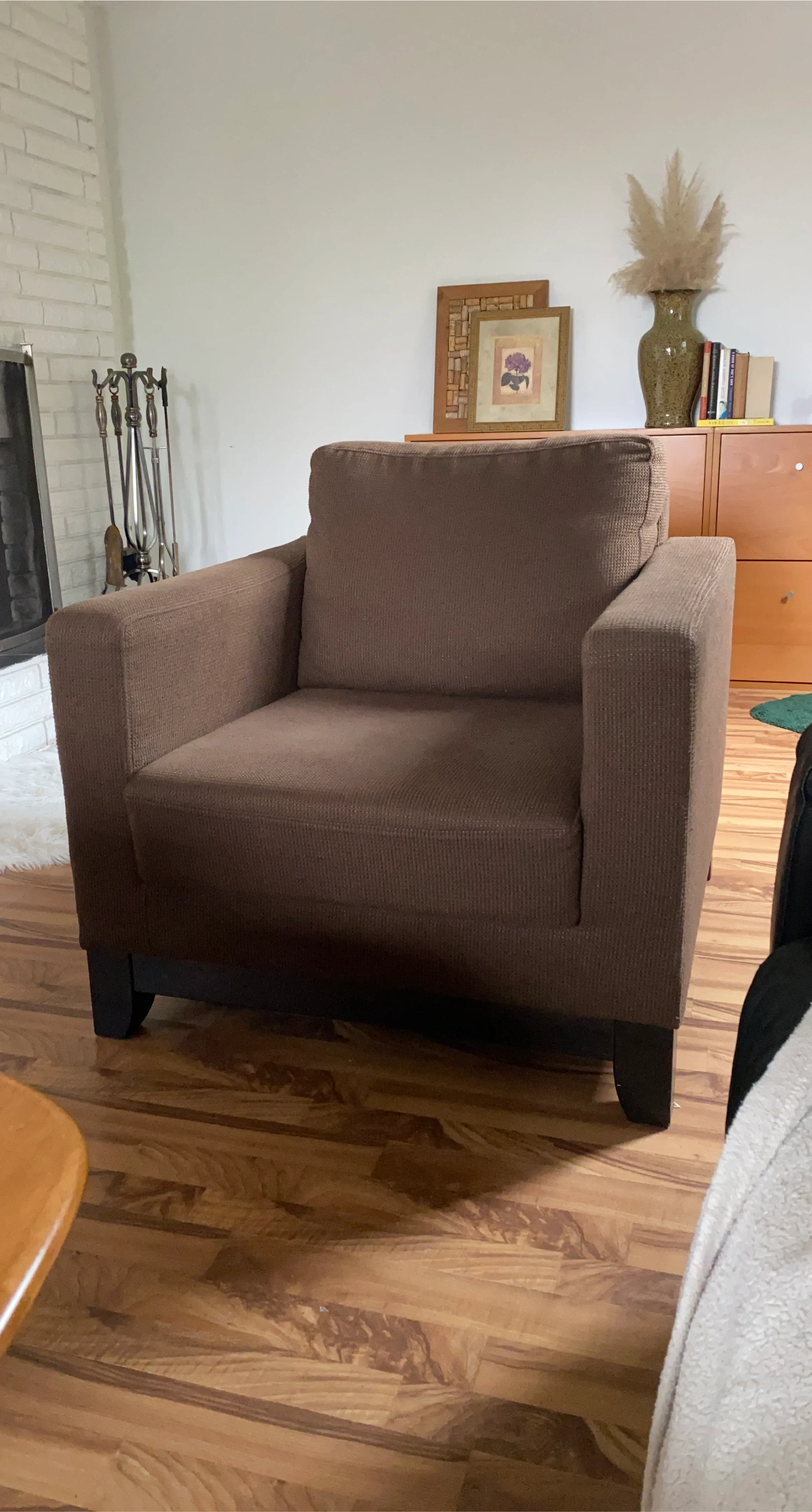 Selling a comfy brown armchair! It's in great condition and would be perfect for any living space. The material is a textured fabric, and it's a nice, neutral brown colour. It's a sturdy and stylish piece of furniture that's ready for a new home.
