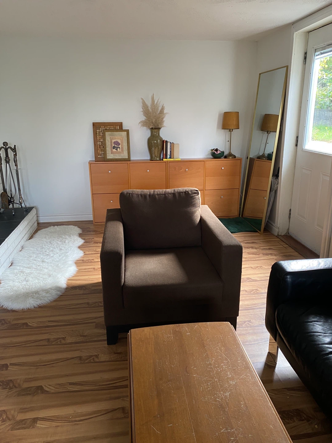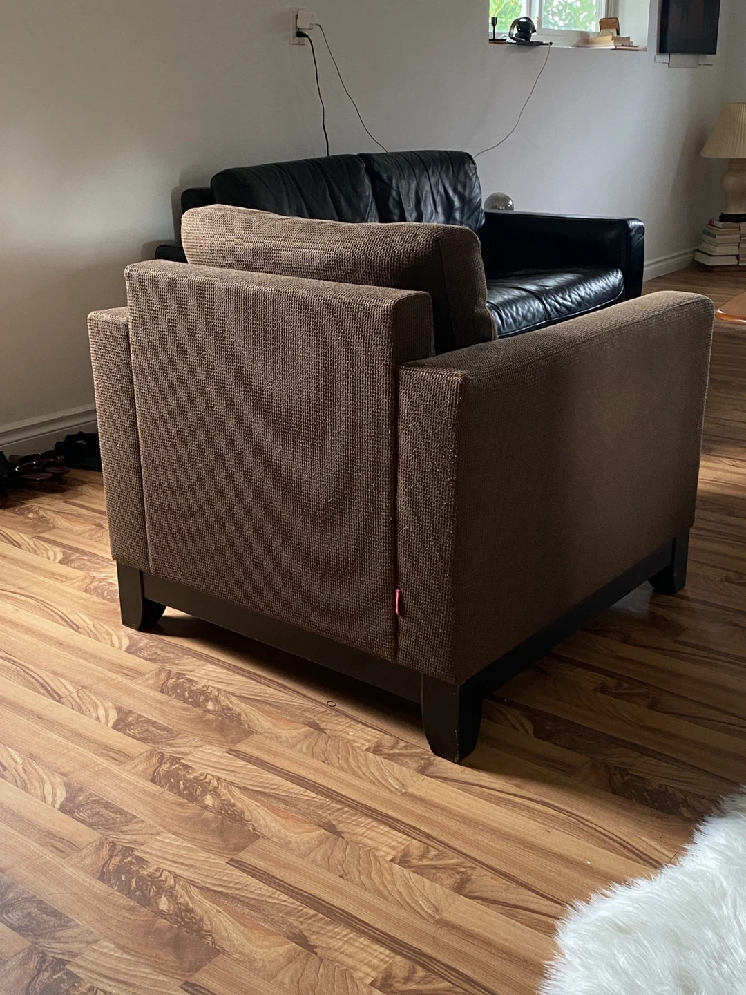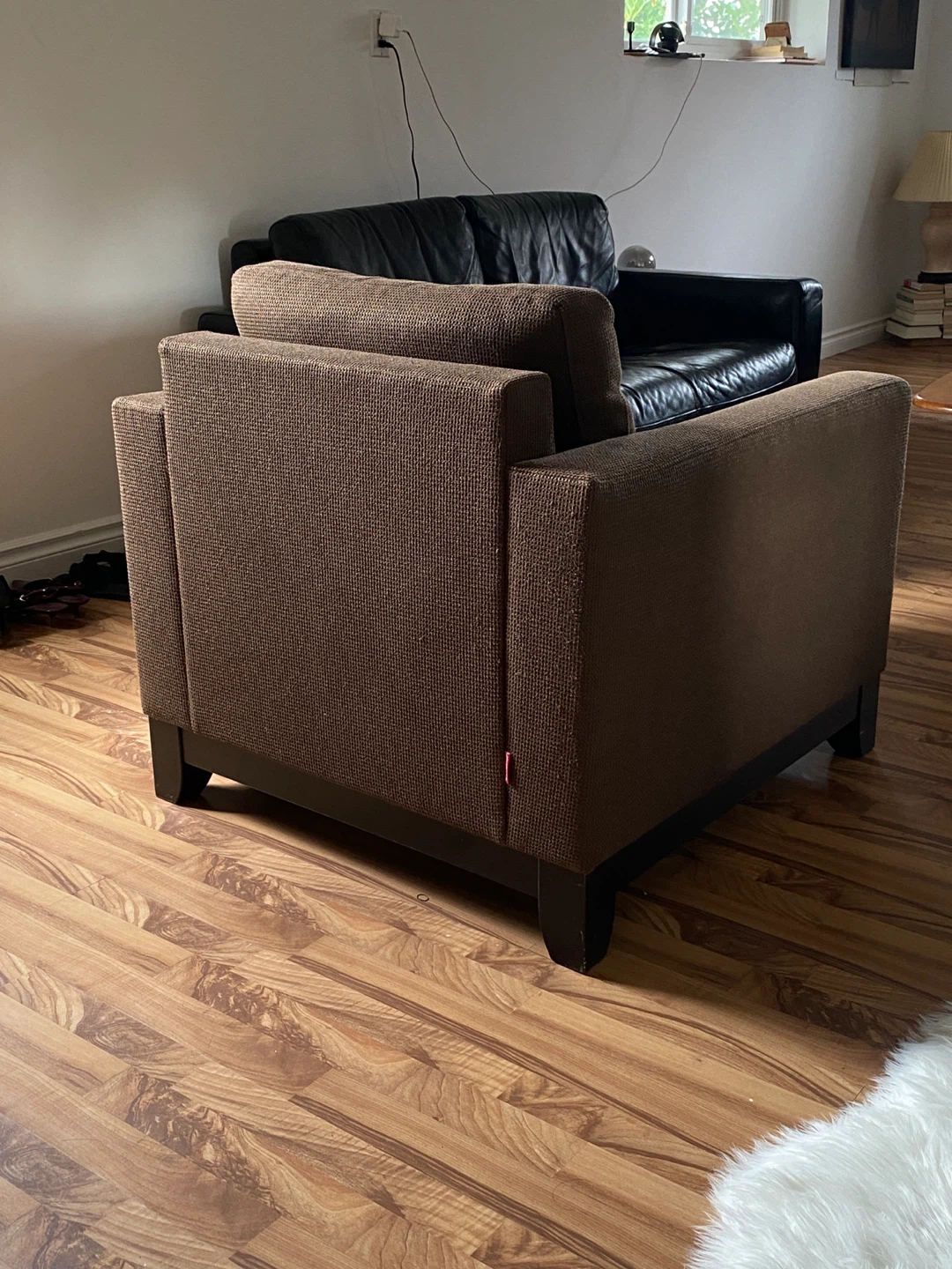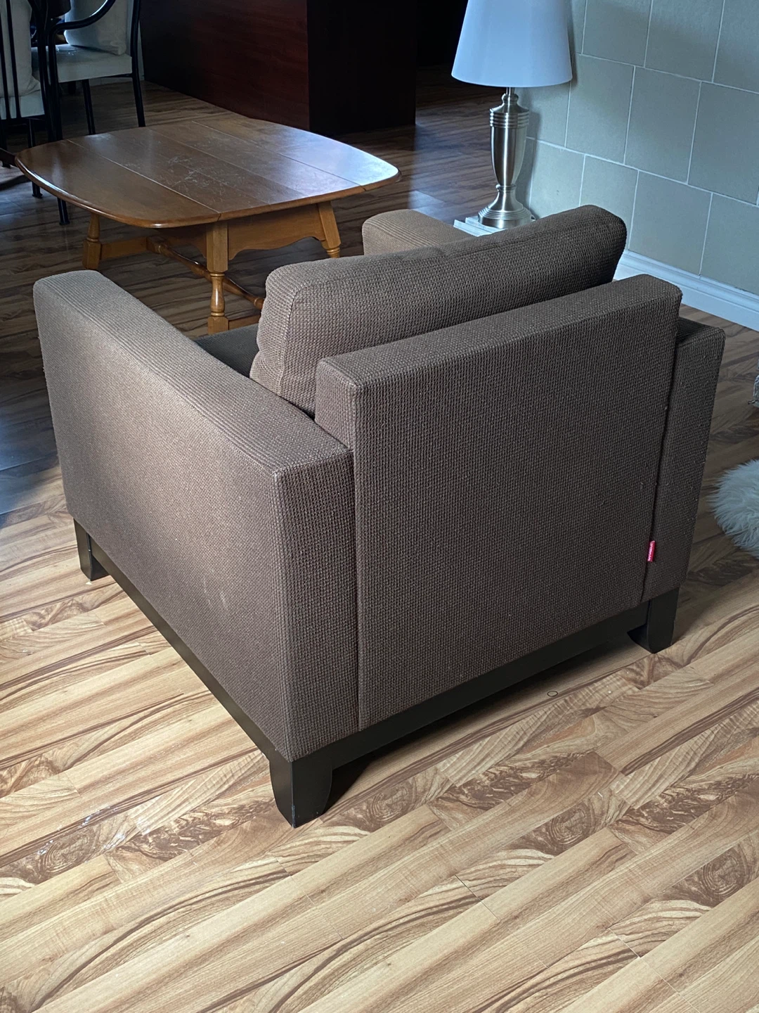 Selling a comfy brown armchair! It's in great condition and would be perfect for any living space. The material is a textured fabric, and it's a nice, neutral brown colour. It's a sturdy and stylish piece of furniture that's ready for a new home.
