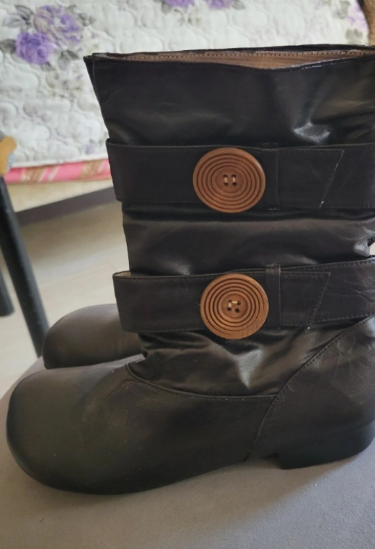 Cute pair of new , size 8, black leather boots! They feature a unique design with wooden button details. Perfect for adding a touch of style to your outfit.