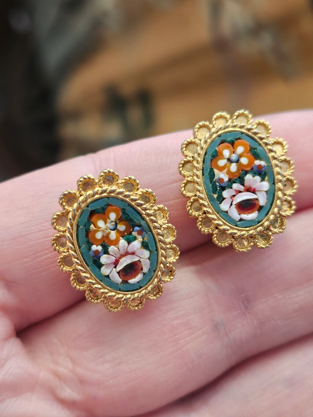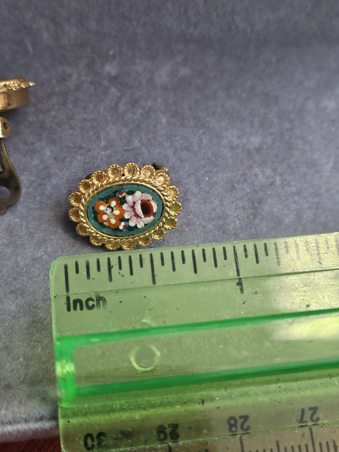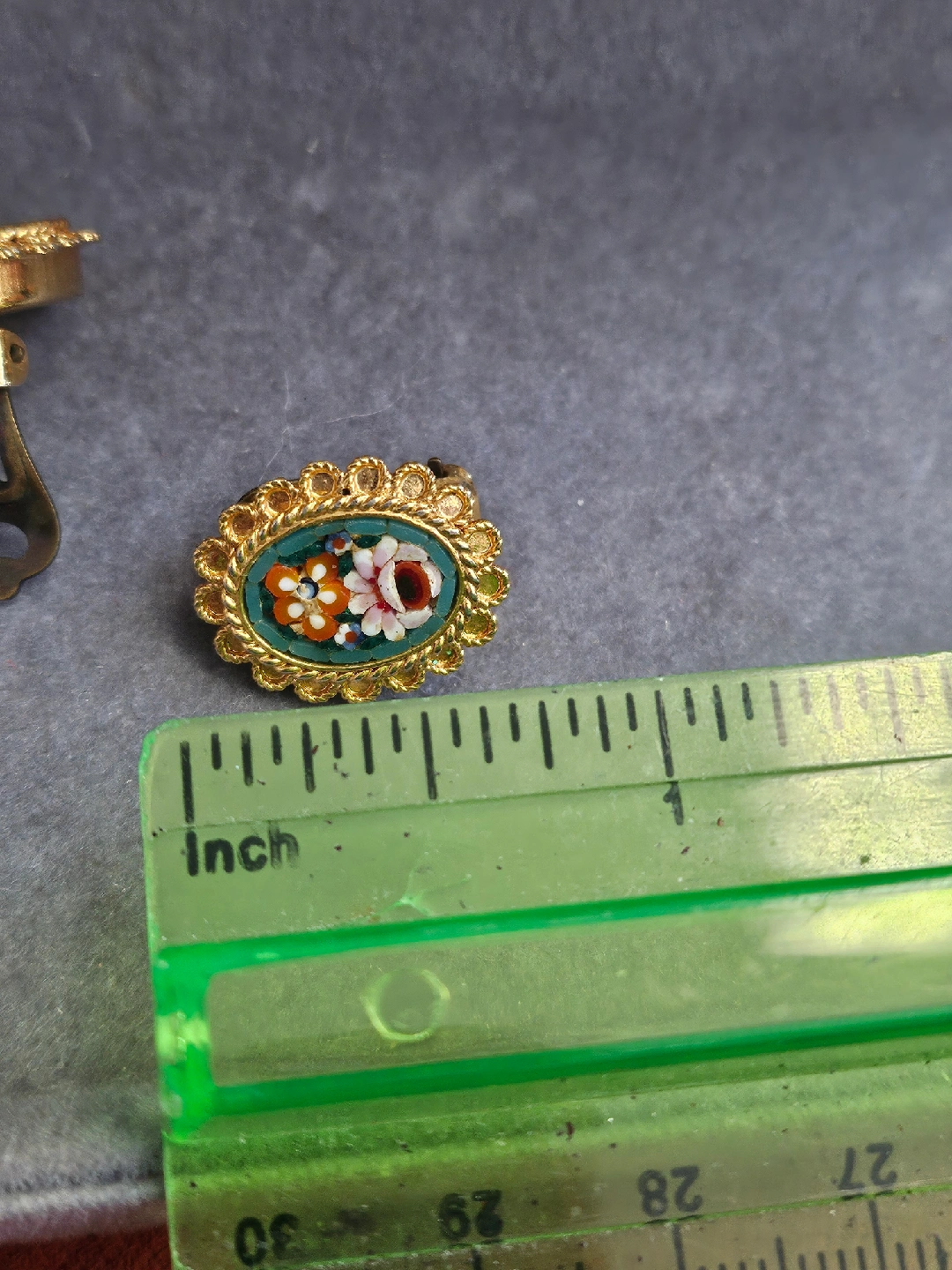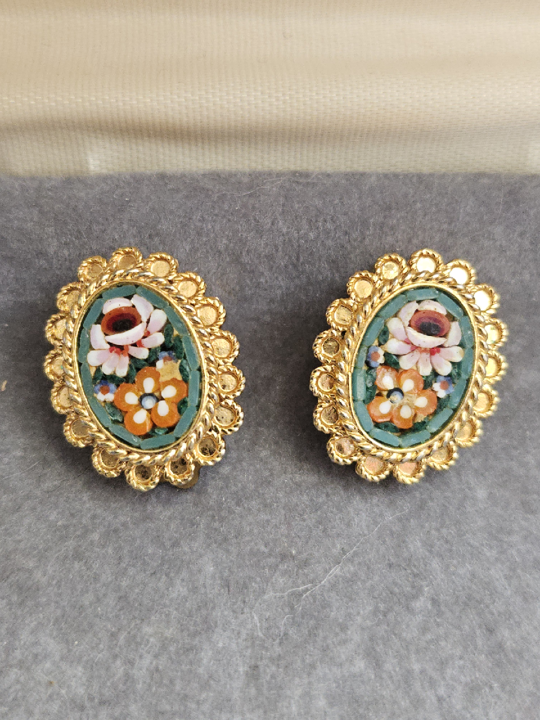 These are a pair of vintage clip-on earrings with a beautiful floral mosaic design! The gold-tone setting adds a touch of elegance to the colourful floral pattern. They're perfect for adding a vintage flair to any outfit!