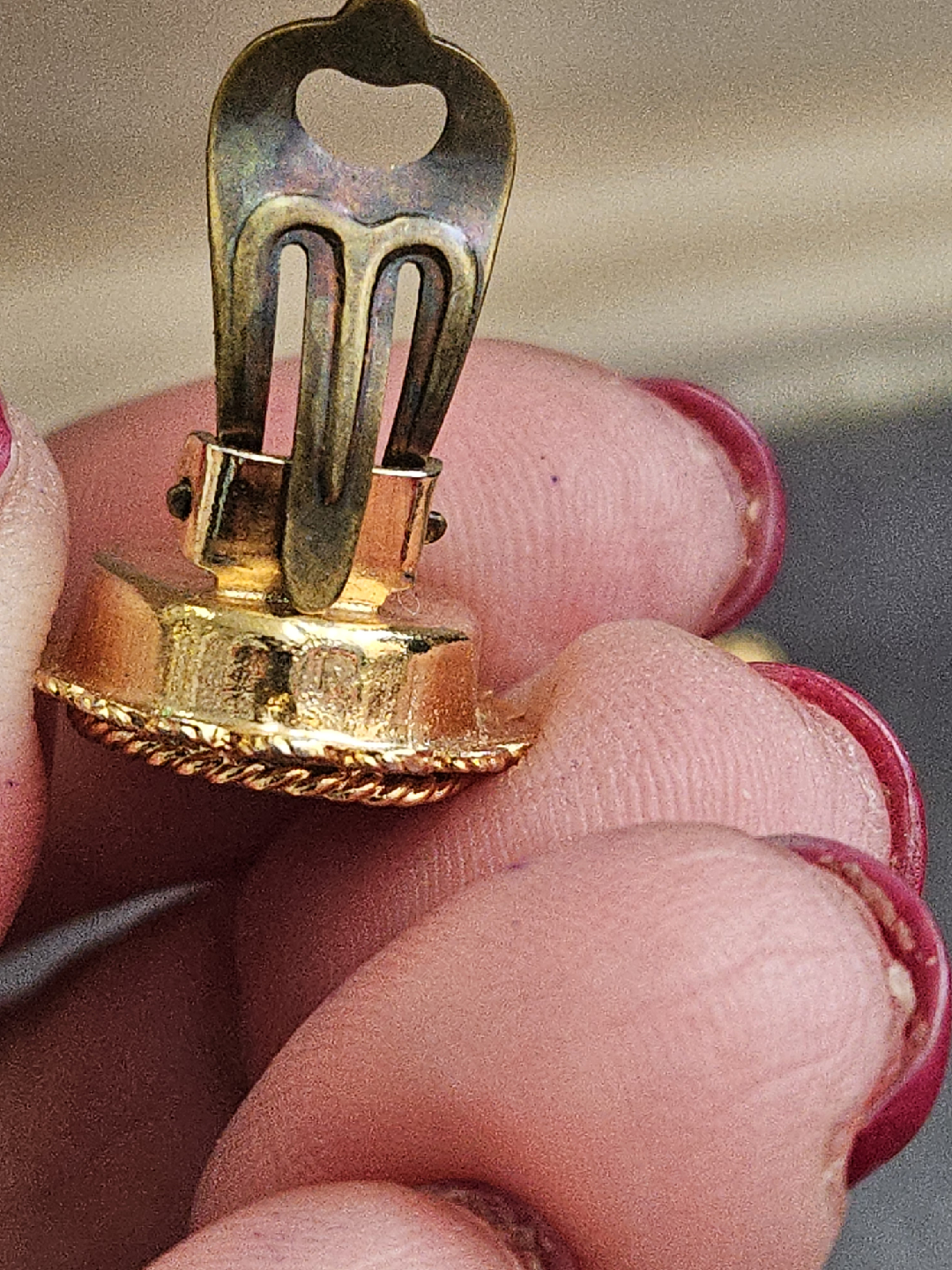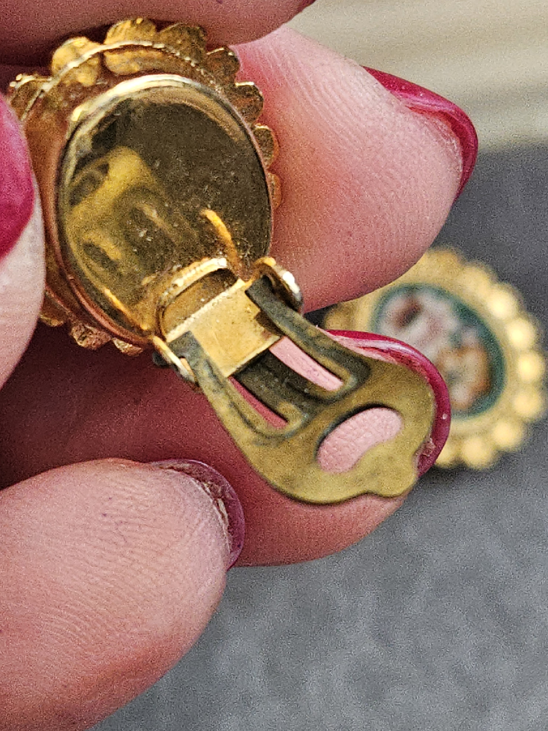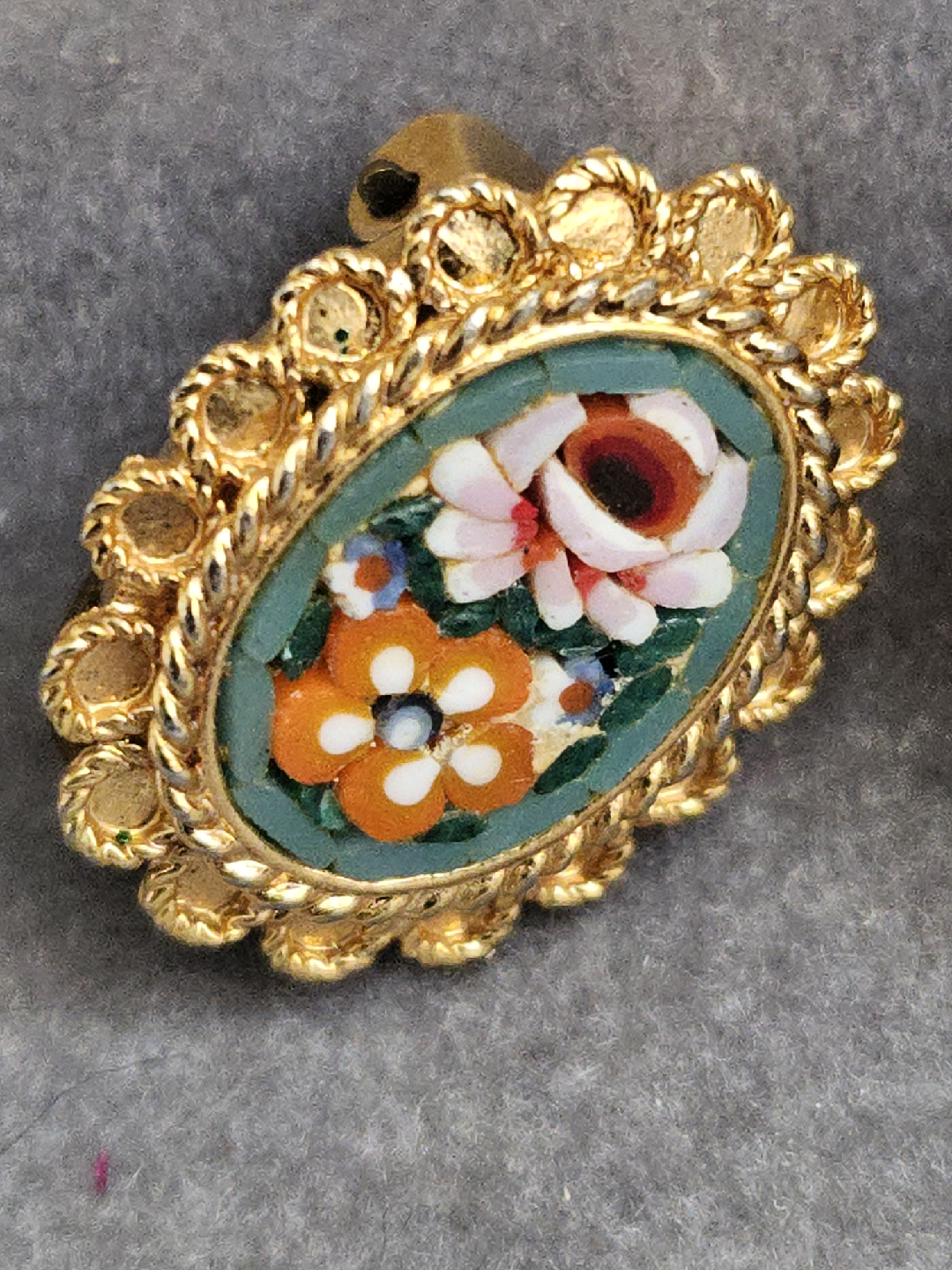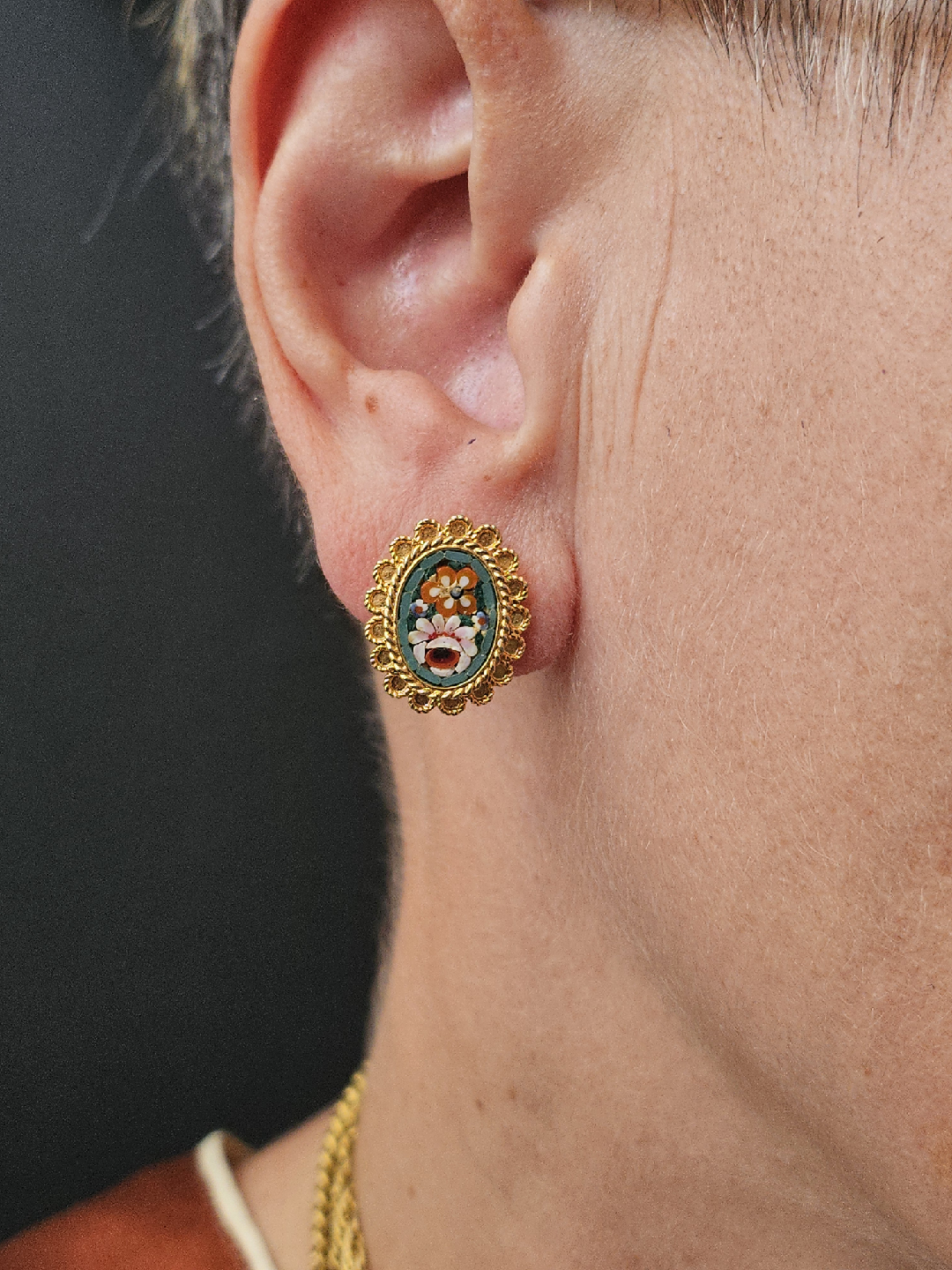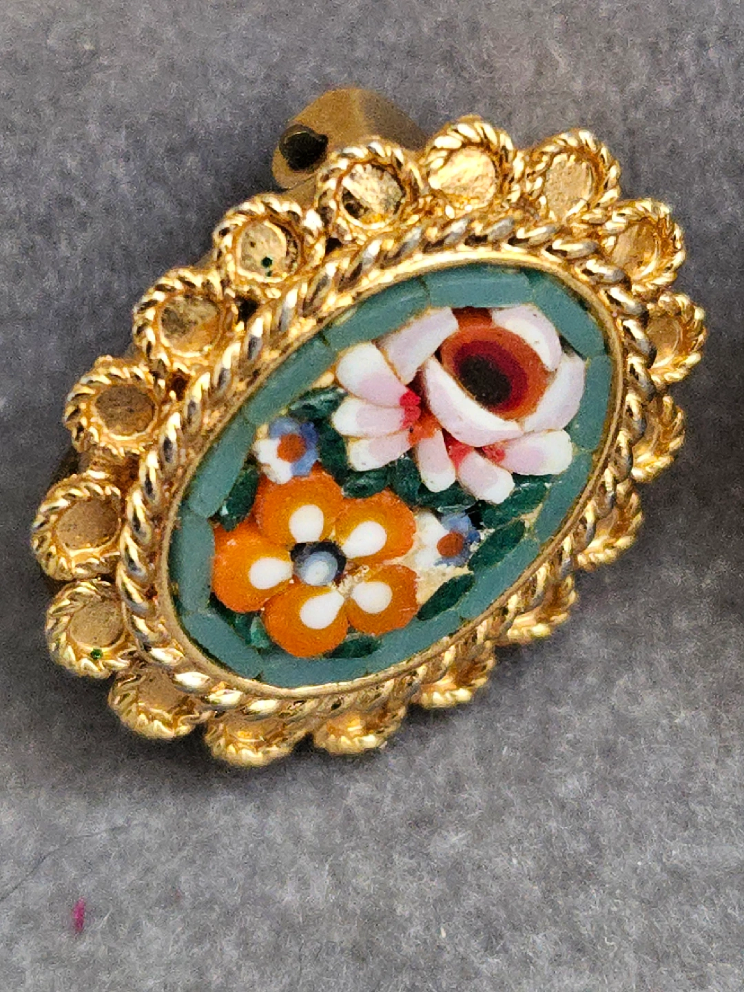 These are a pair of vintage clip-on earrings with a beautiful floral mosaic design! The gold-tone setting adds a touch of elegance to the colourful floral pattern. They're perfect for adding a vintage flair to any outfit!