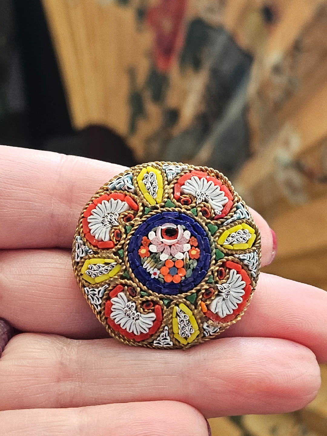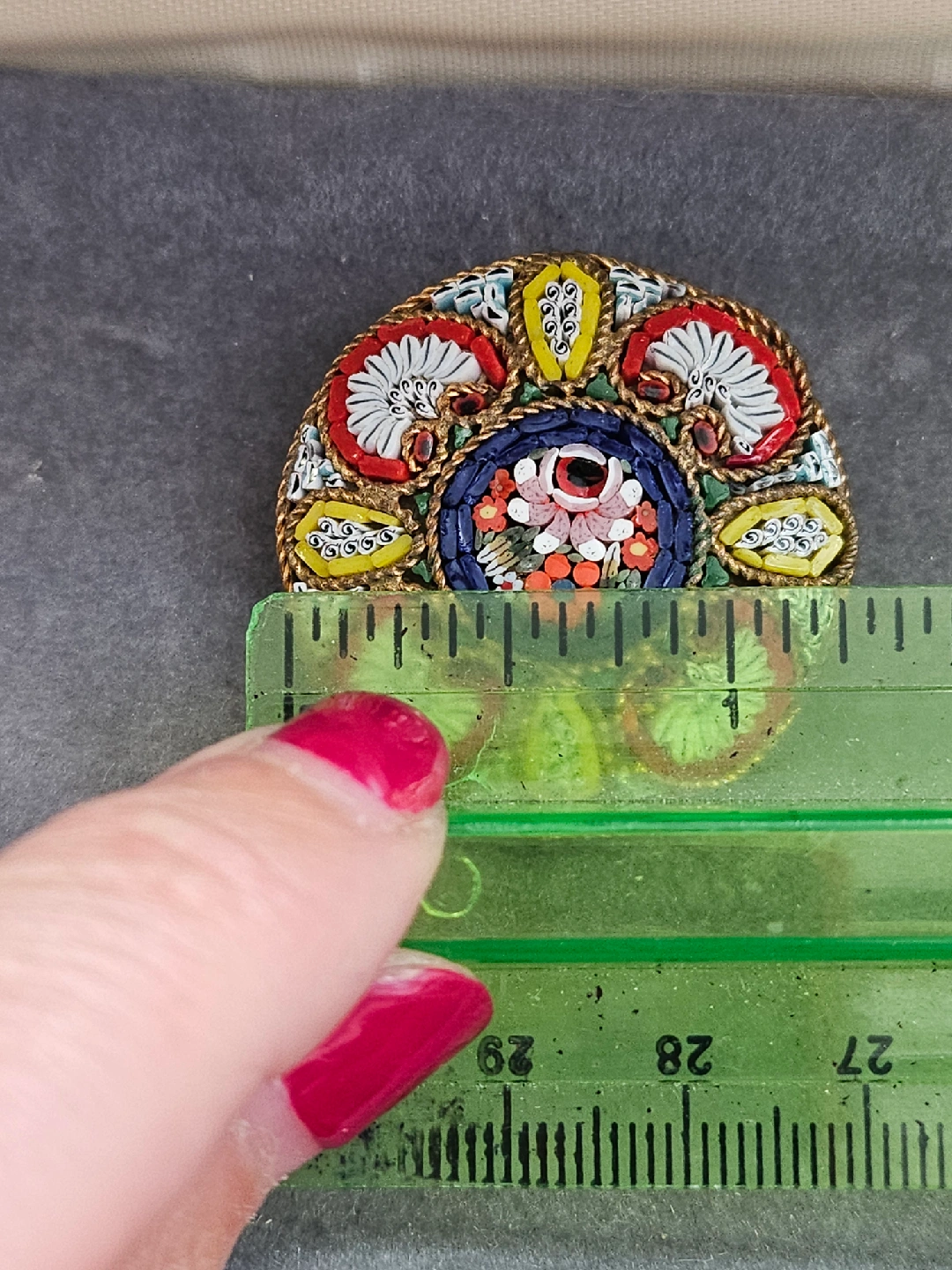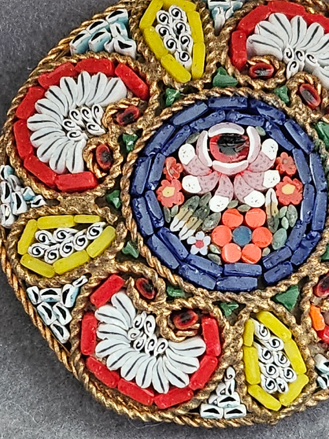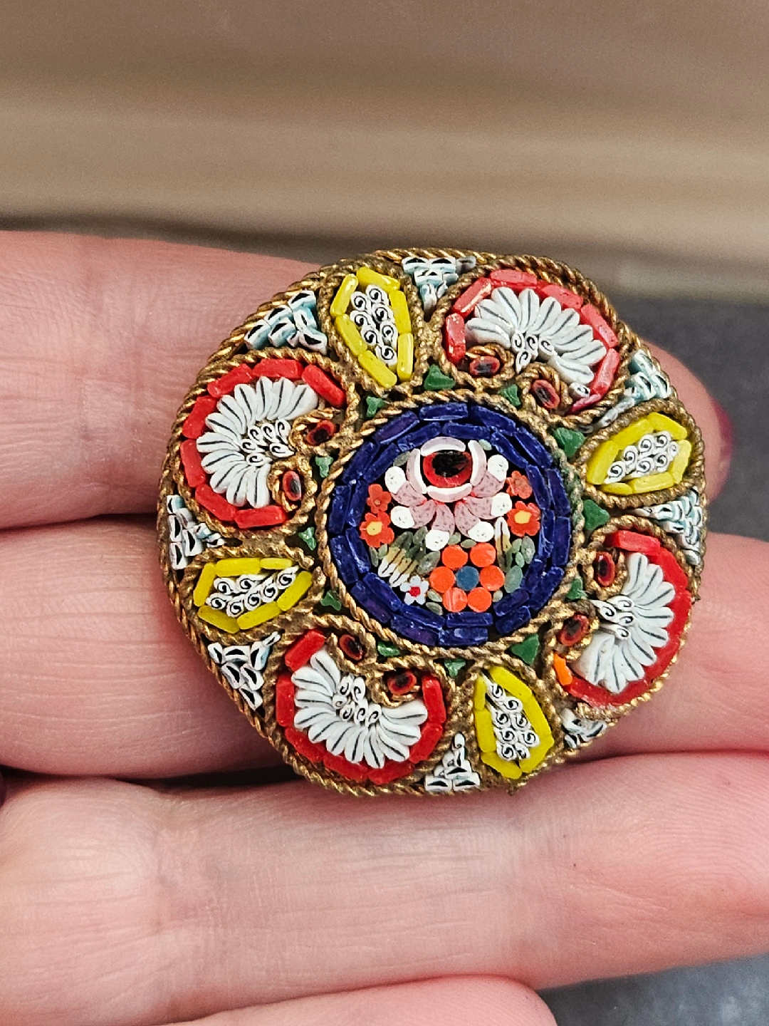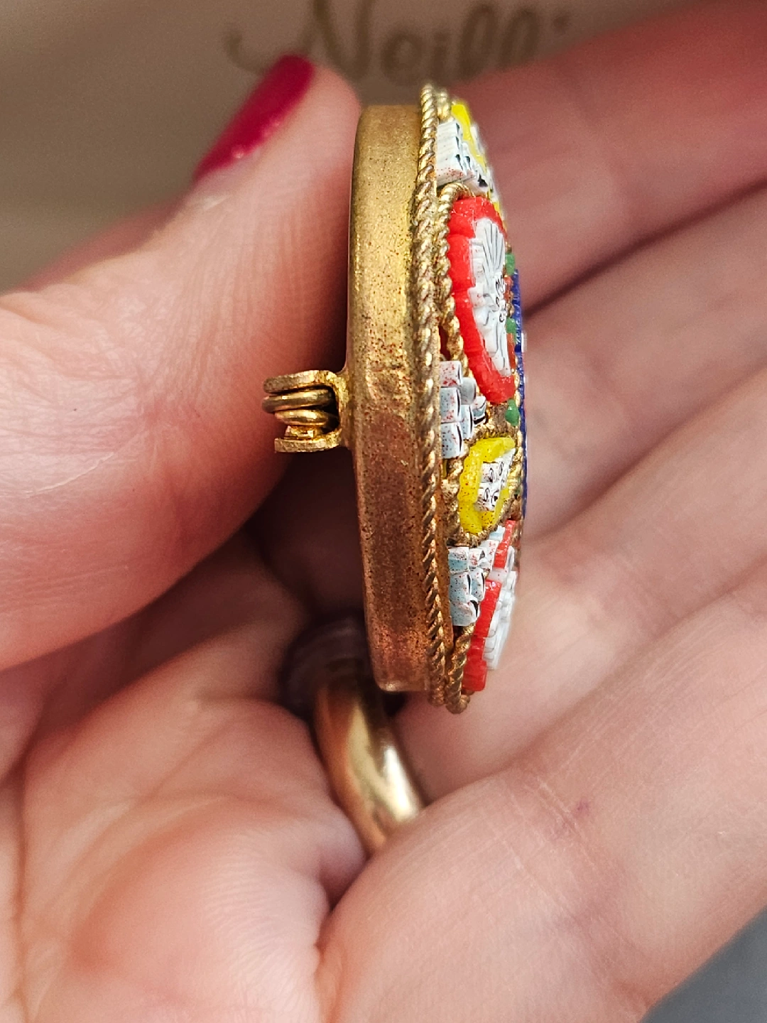 Beautiful vintage micro mosaic brooch with a floral design. The intricate details and vibrant colours make it a unique piece. It is in great condition and ready to add a touch of vintage charm to any outfit