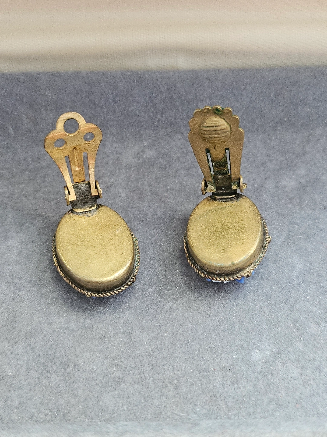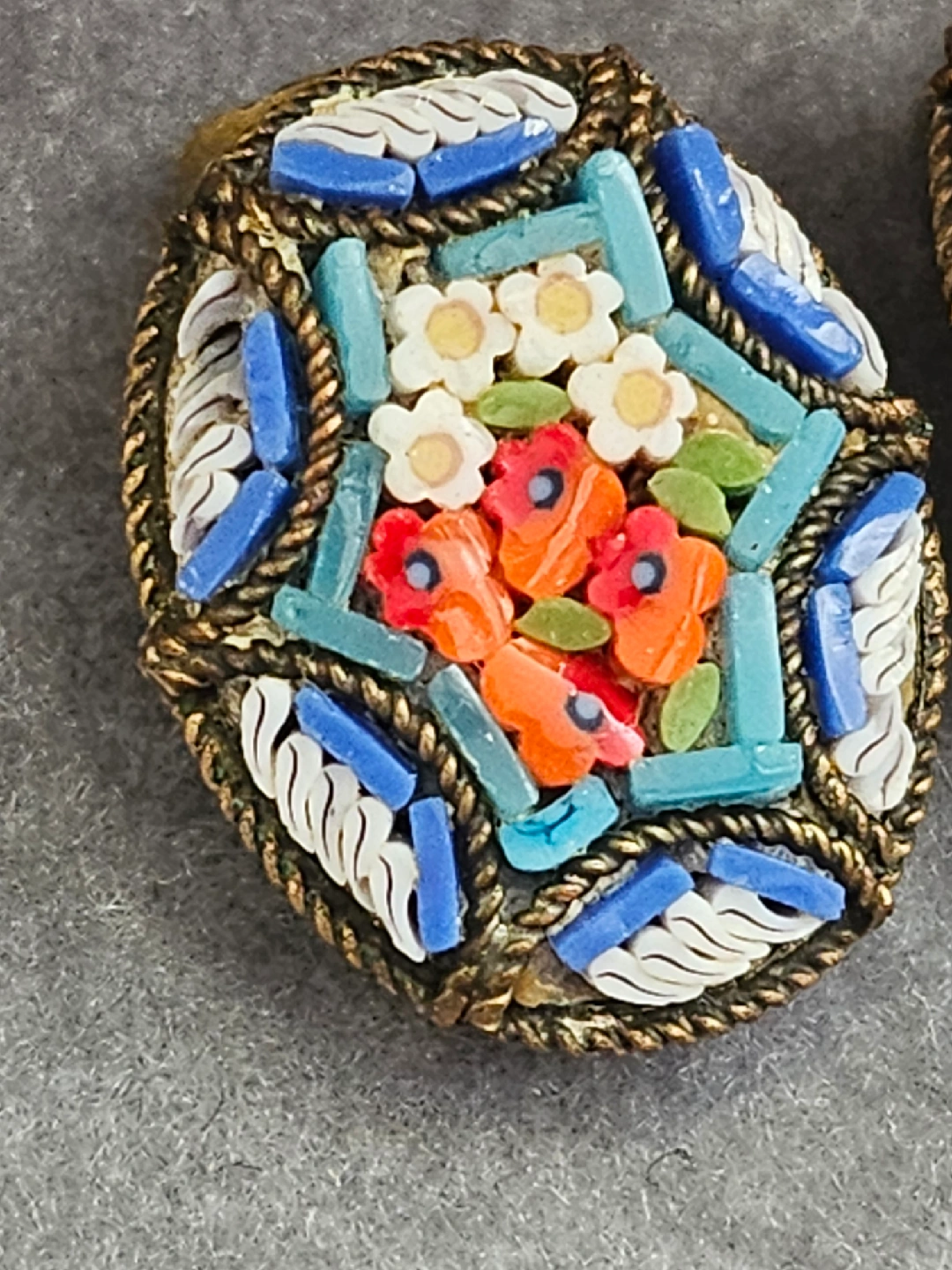 These are a pair of vintage clip-on earrings featuring a beautiful mosaic design. The mosaic includes small tiles in white, blue, red, orange, and green, arranged in a floral pattern. They have a unique and classic look!