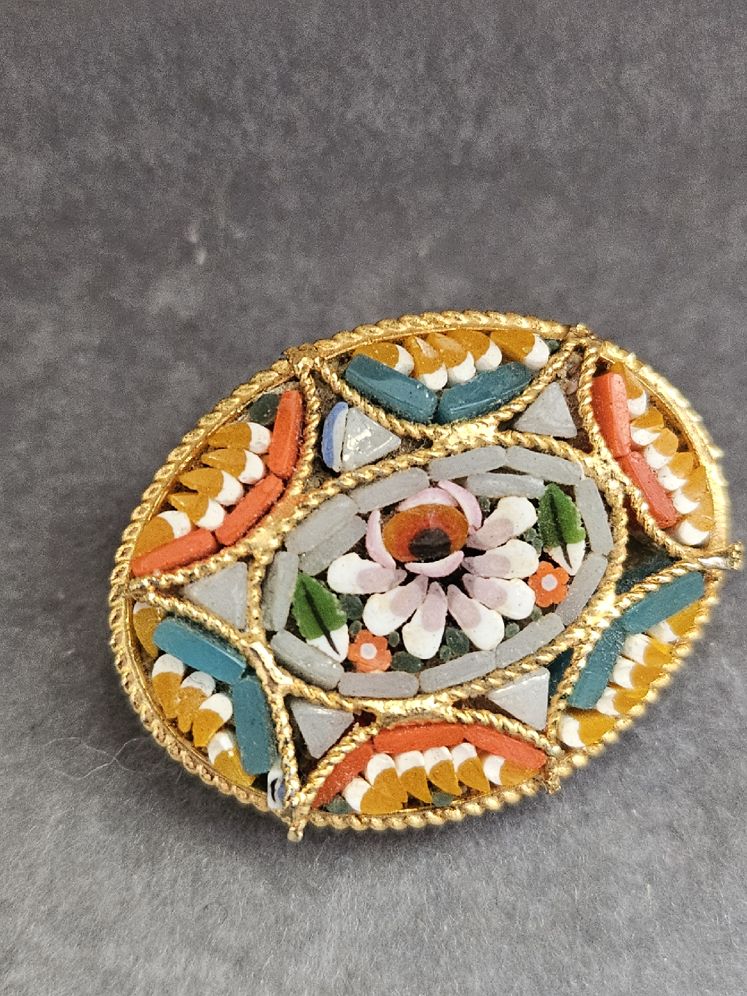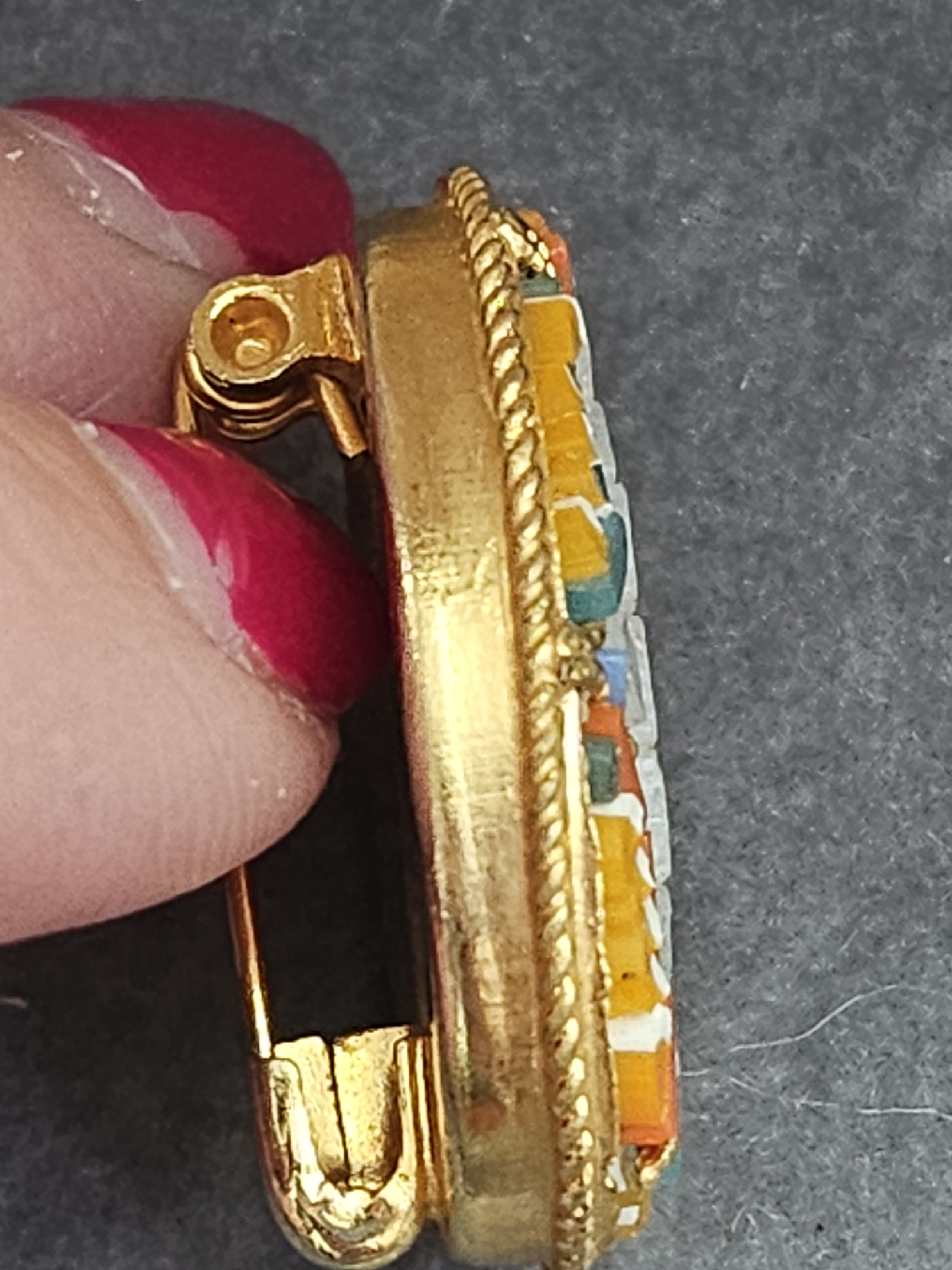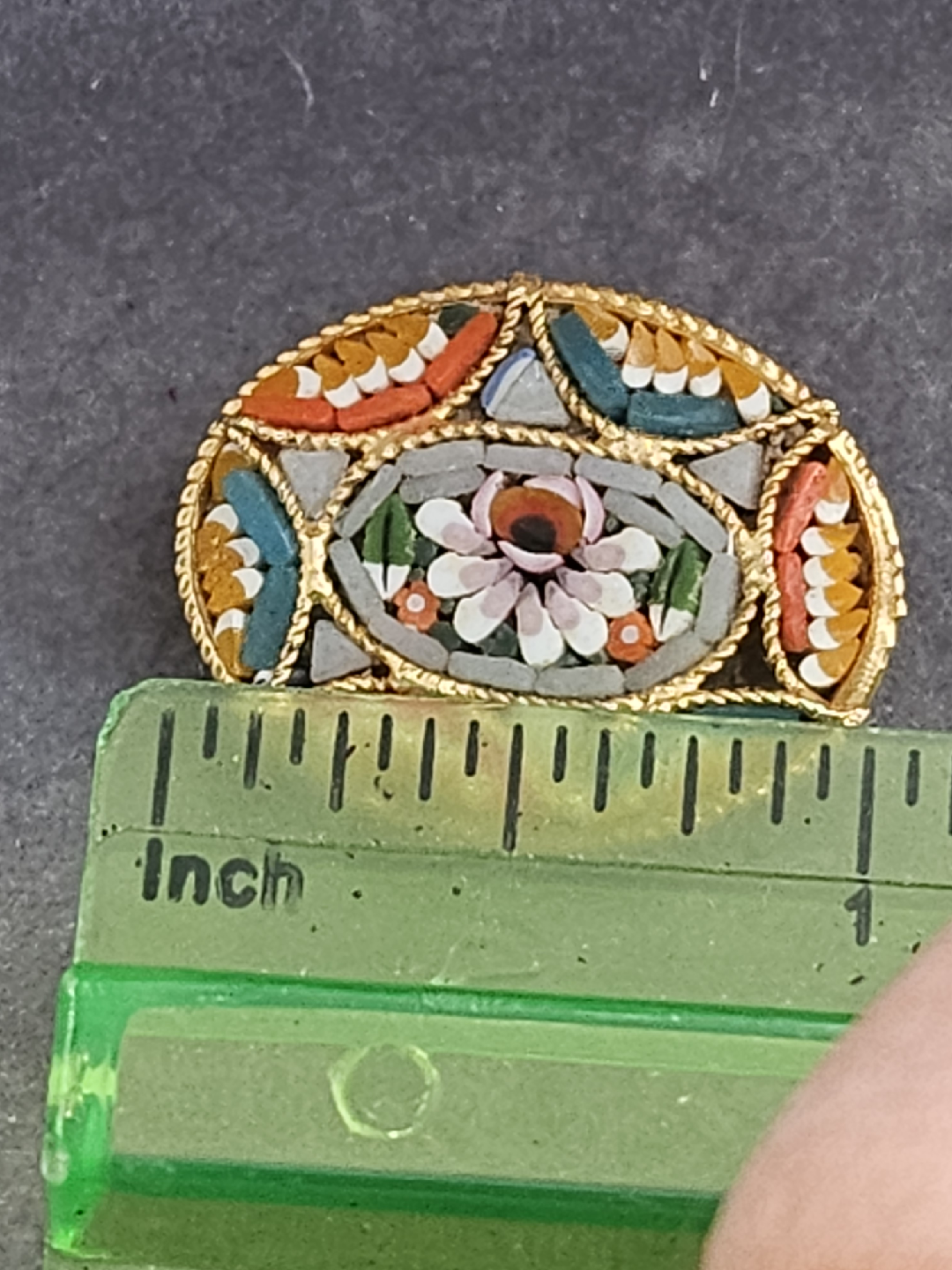 Selling a lovely vintage brooch marked Capri and Italy. The brooch features a beautiful micro mosaic design with floral elements and colourful tesserae set in a gold-tone metal frame. It's in great condition and ready to add a touch of vintage charm to your collection