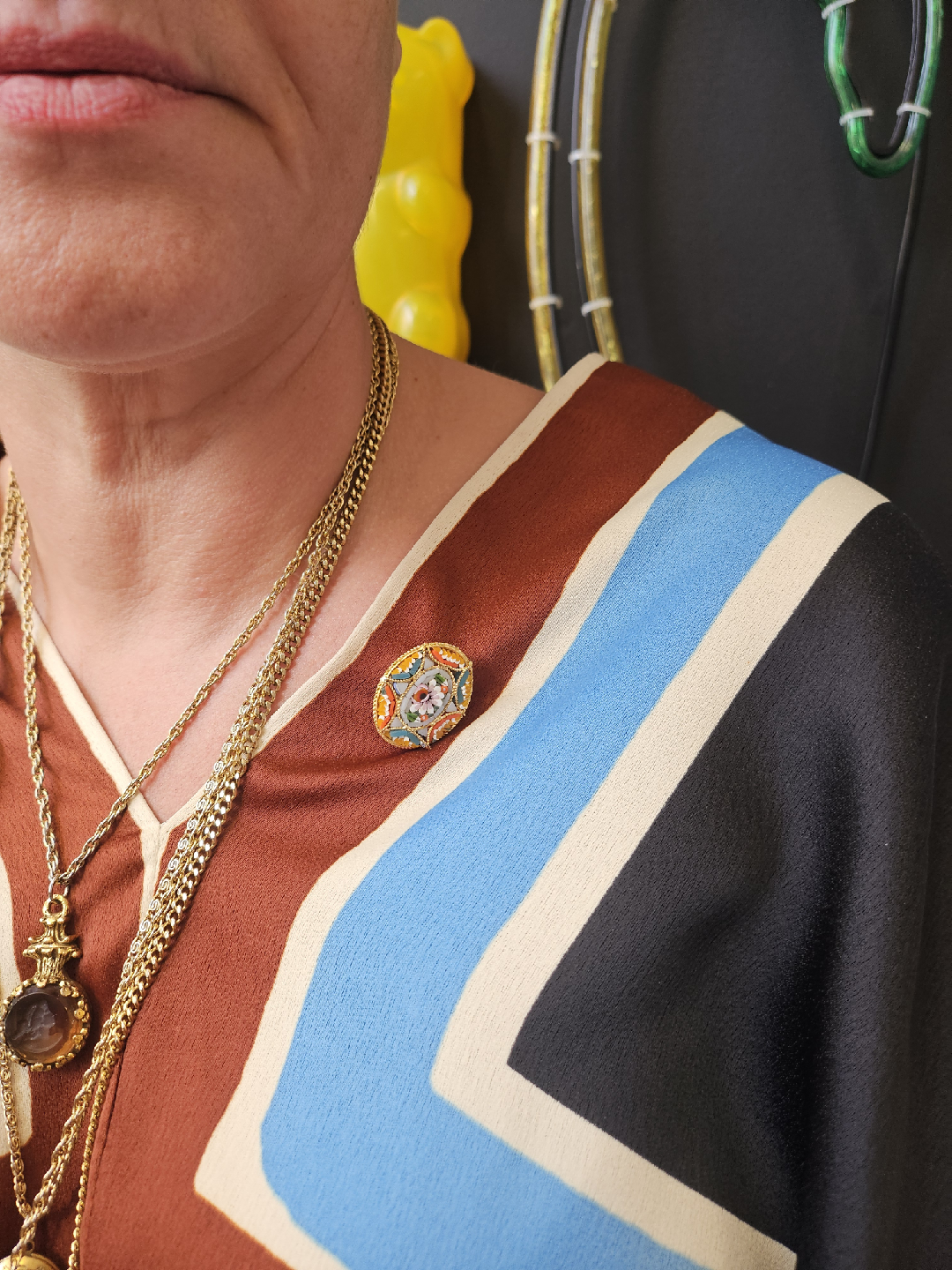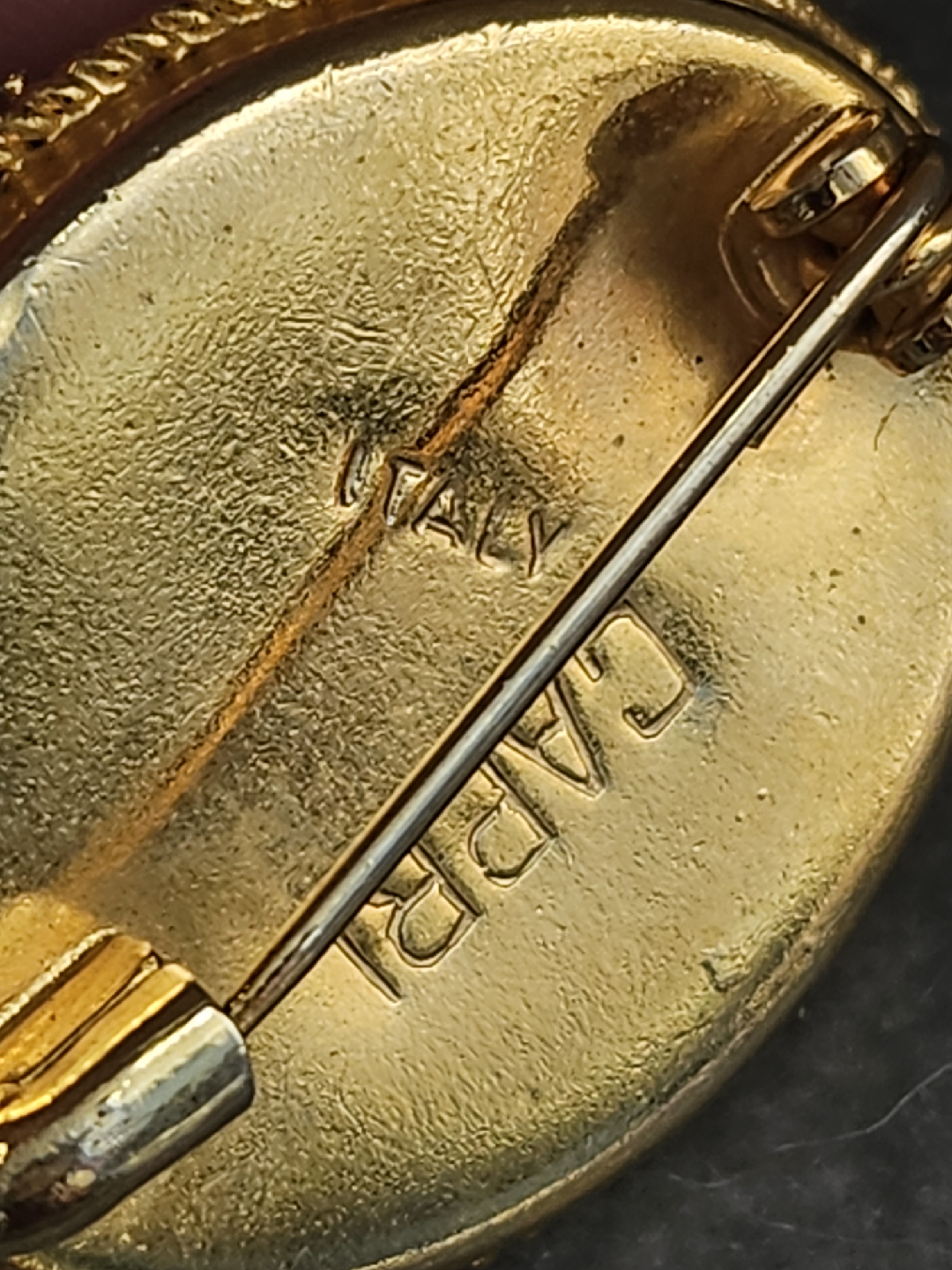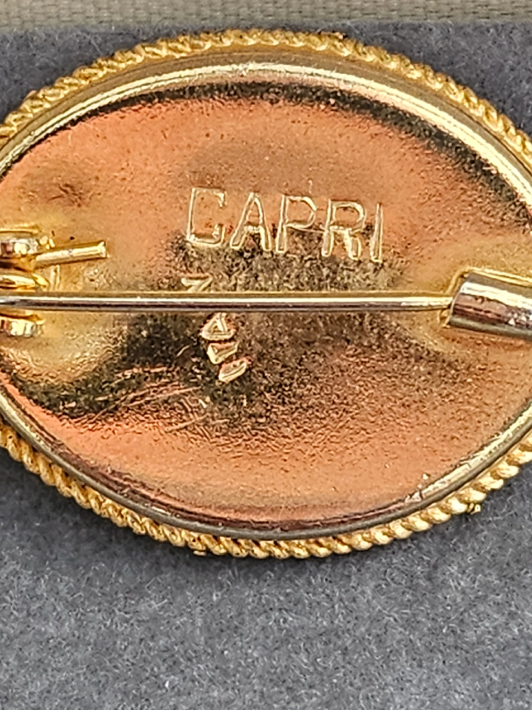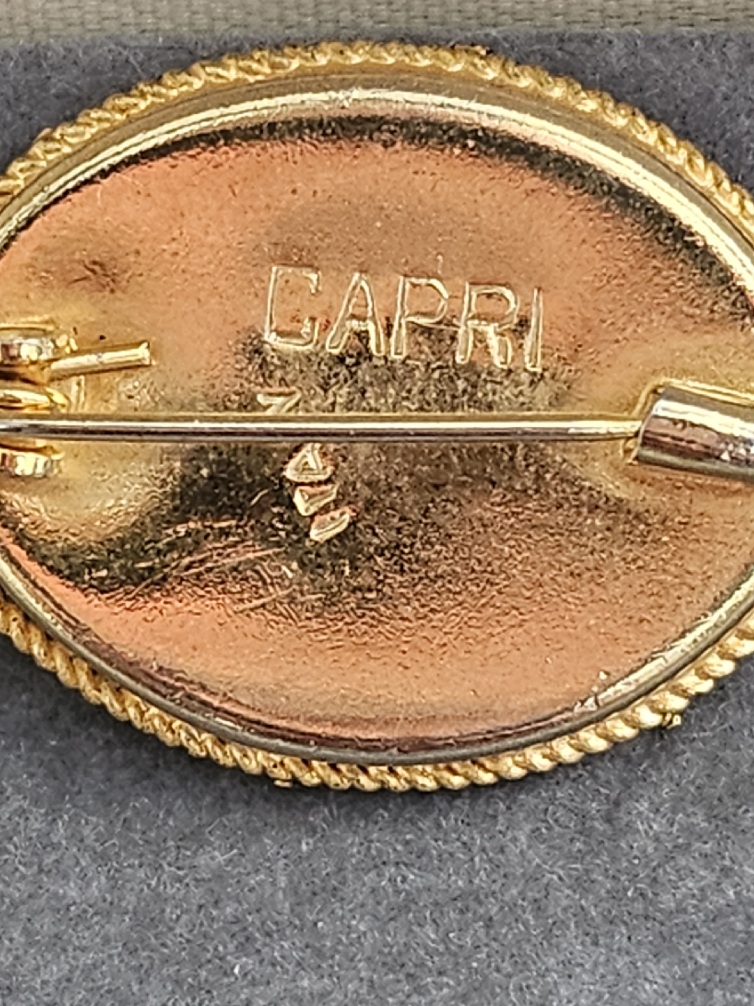 Selling a lovely vintage brooch marked Capri and Italy. The brooch features a beautiful micro mosaic design with floral elements and colourful tesserae set in a gold-tone metal frame. It's in great condition and ready to add a touch of vintage charm to your collection