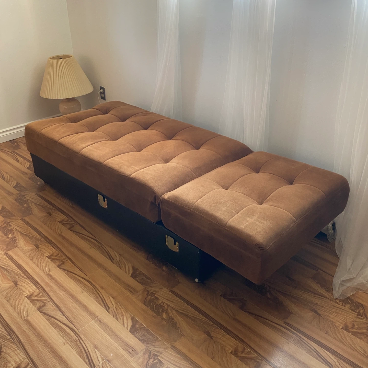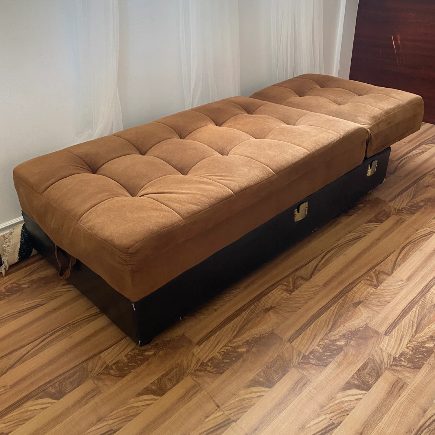 The futon is brown with a tufted design on the top cushion and a dark brown/black base. It has storage, making it a versatile piece of furniture for any home.