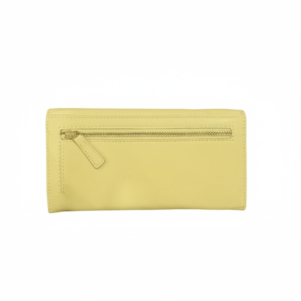 Selling a light yellow leather wallet! It has been in my closet for a while but it has never been used, and the exact shade of yellow is shown on the first two and last two slides. The wallet measures approximately 19.5 cm long and 10 cm wide. It has a zipper compartment and lots of slots for cards and cash.