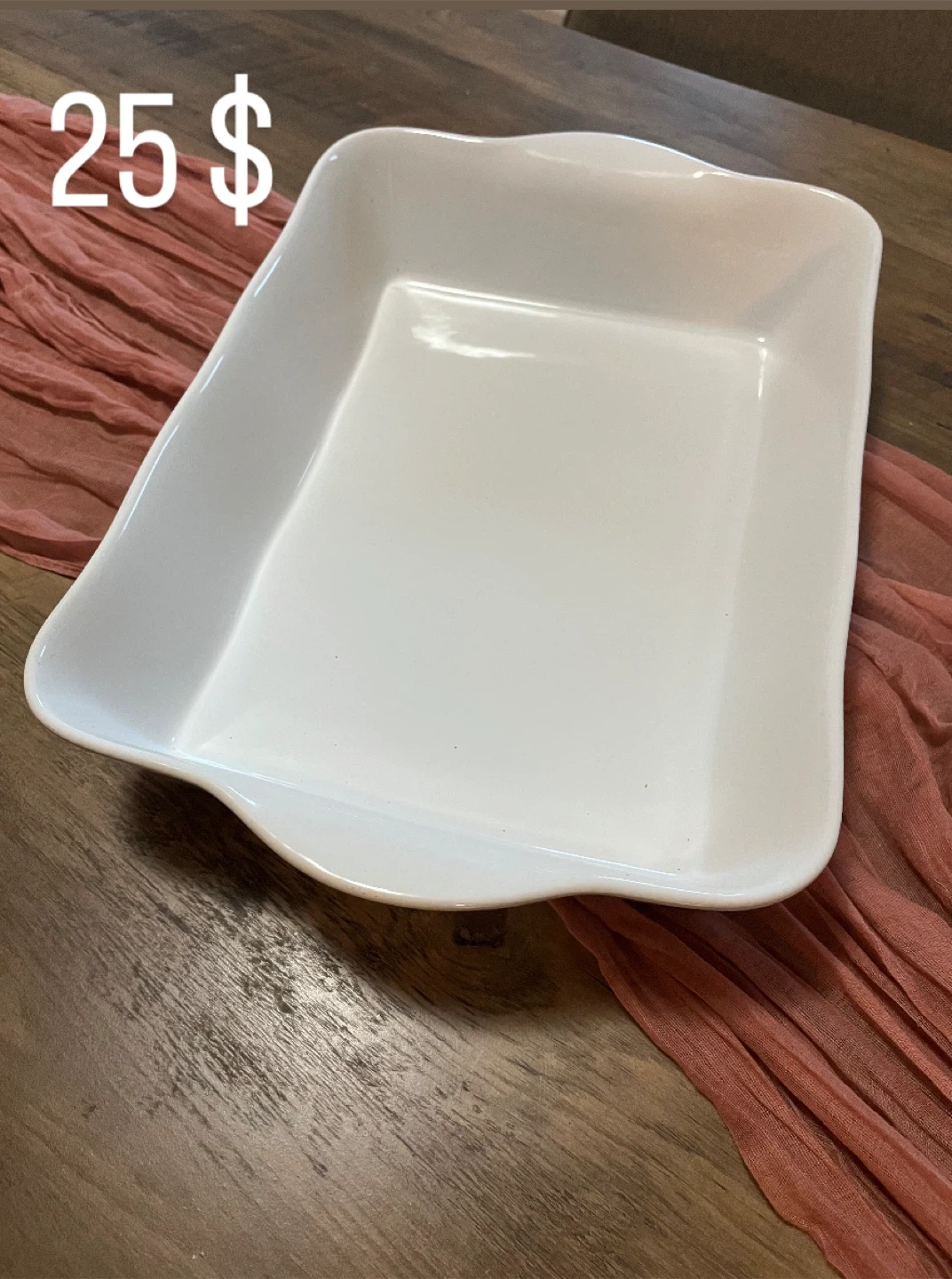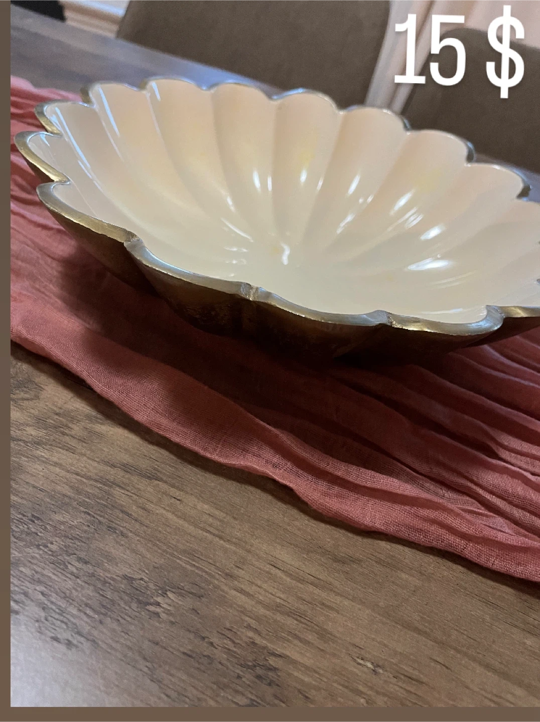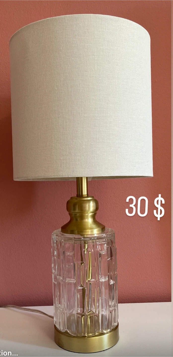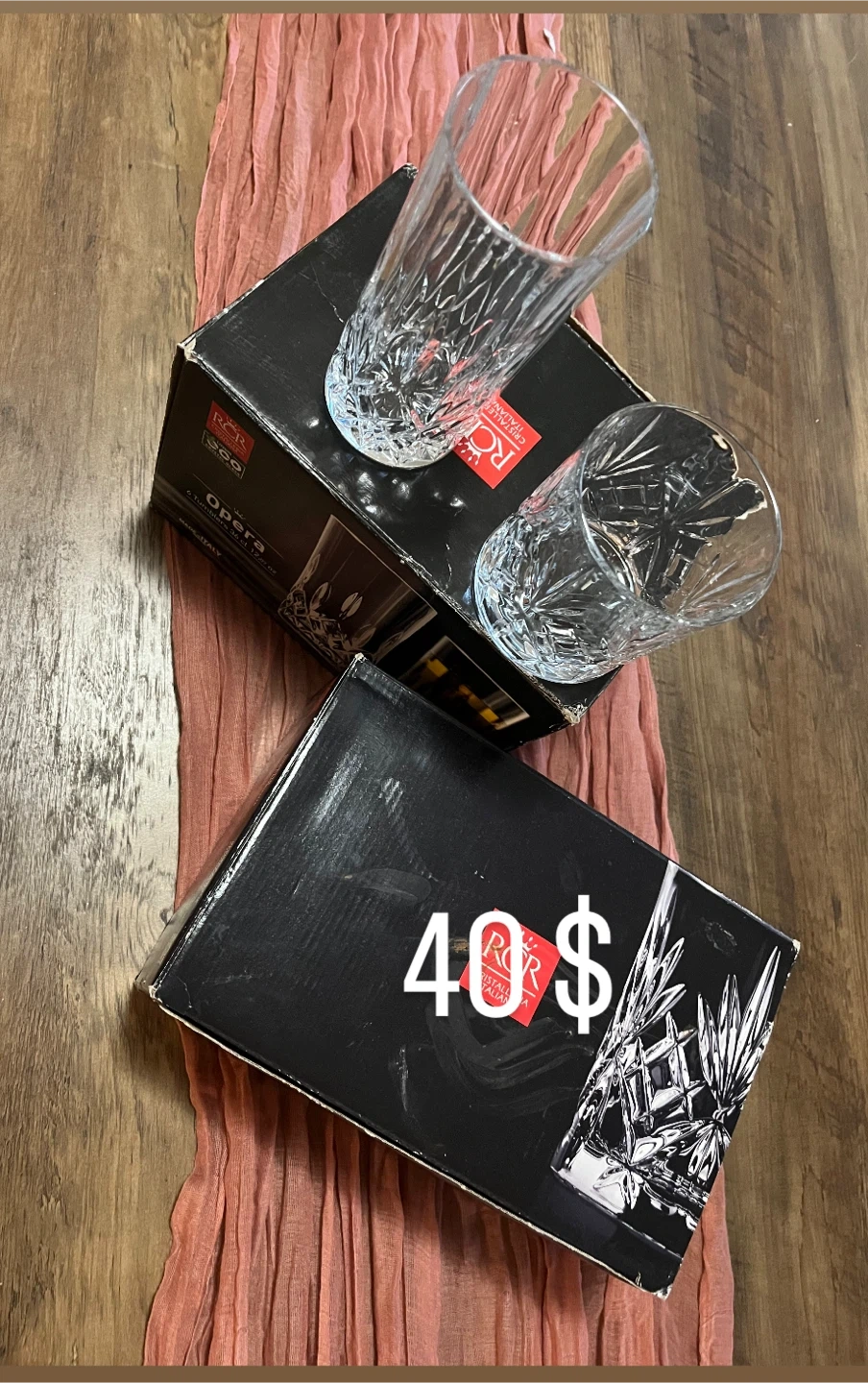 A collection of home decor items to add a touch of elegance to your space! Included are a table lamp with a clear textured base and neutral shade, a three-tiered serving stand with gold trim, a square white bowl, a decorative bowl with a scalloped edge, and a set of RCR Opera crystal glasses in their original box