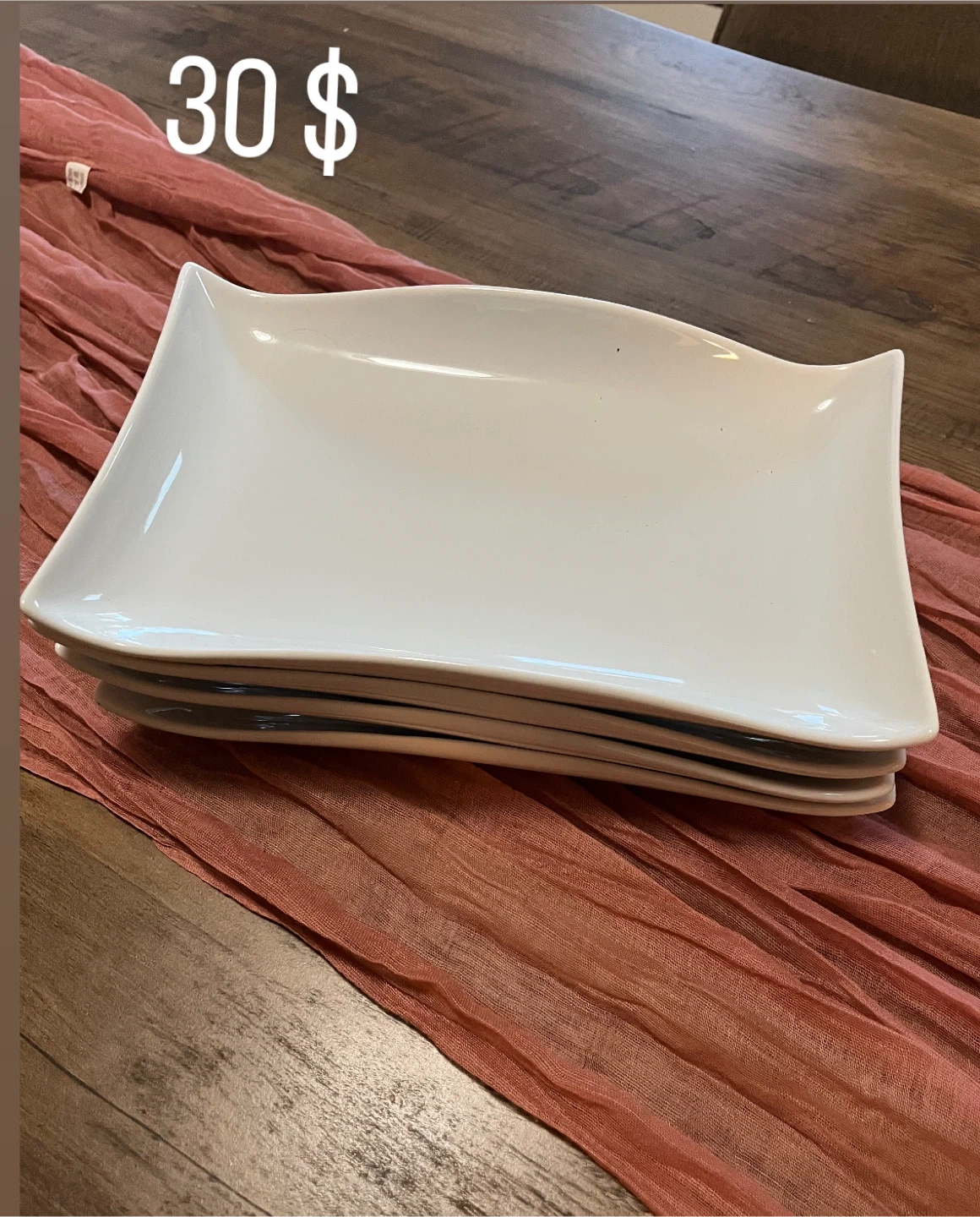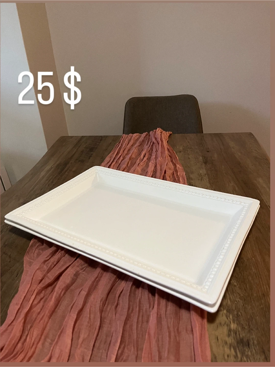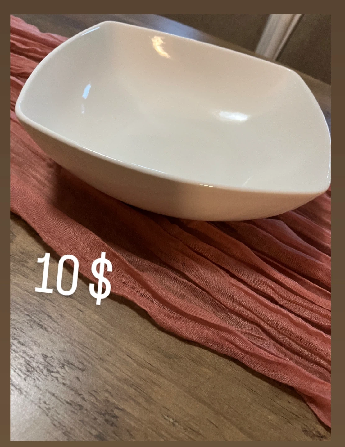 A collection of home decor items to add a touch of elegance to your space! Included are a table lamp with a clear textured base and neutral shade, a three-tiered serving stand with gold trim, a square white bowl, a decorative bowl with a scalloped edge, and a set of RCR Opera crystal glasses in their original box