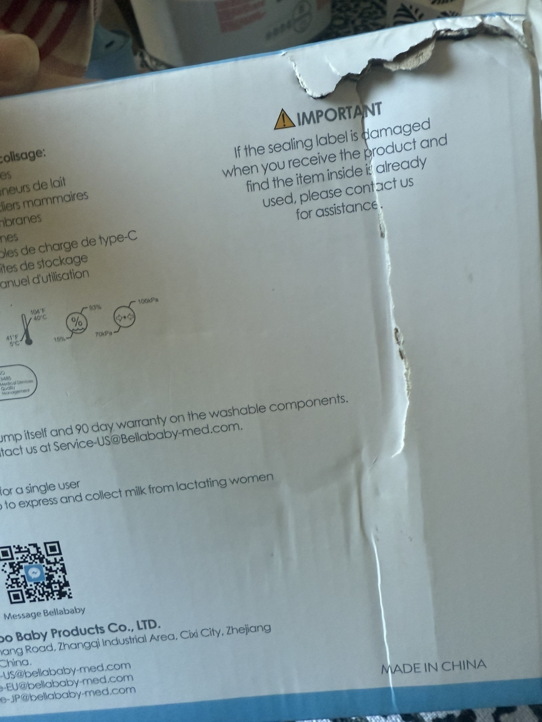 Selling a brand new Bellababy electric breast pump. It comes with two pumps and fits in your bra, changing your feeding life. The box includes the pumps and a charger. Damage box. Open box for pictures purposes. Retail price is in the picture. Kindly check it and read the description before making a transaction.