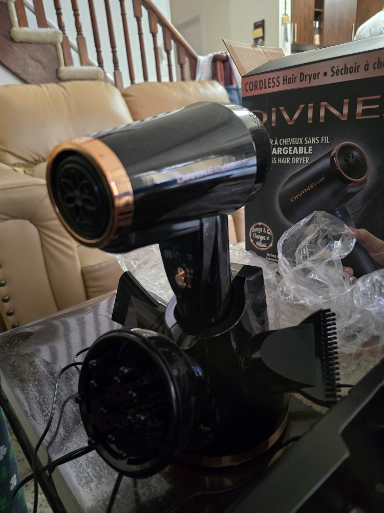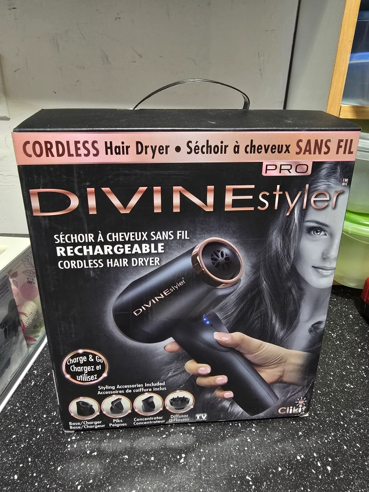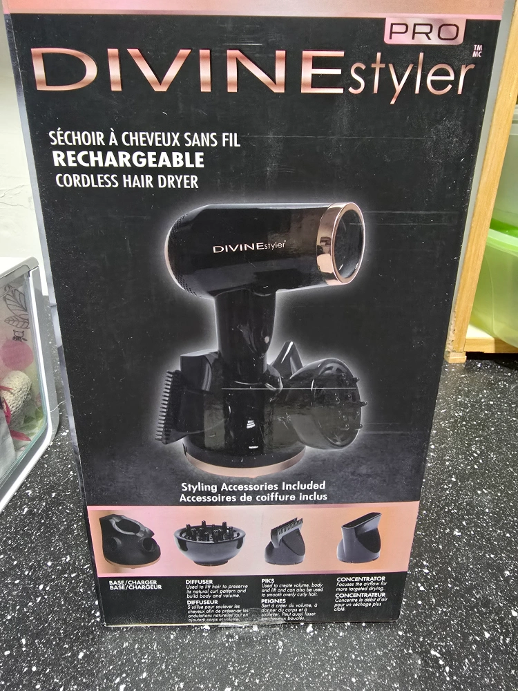 38Selling a Divine Styler Pro cordless hair dryer. It's rechargeable and comes with styling accessories, including a base/charger, diffuser, pike, and concentrator. Perfect for creating volume and body!