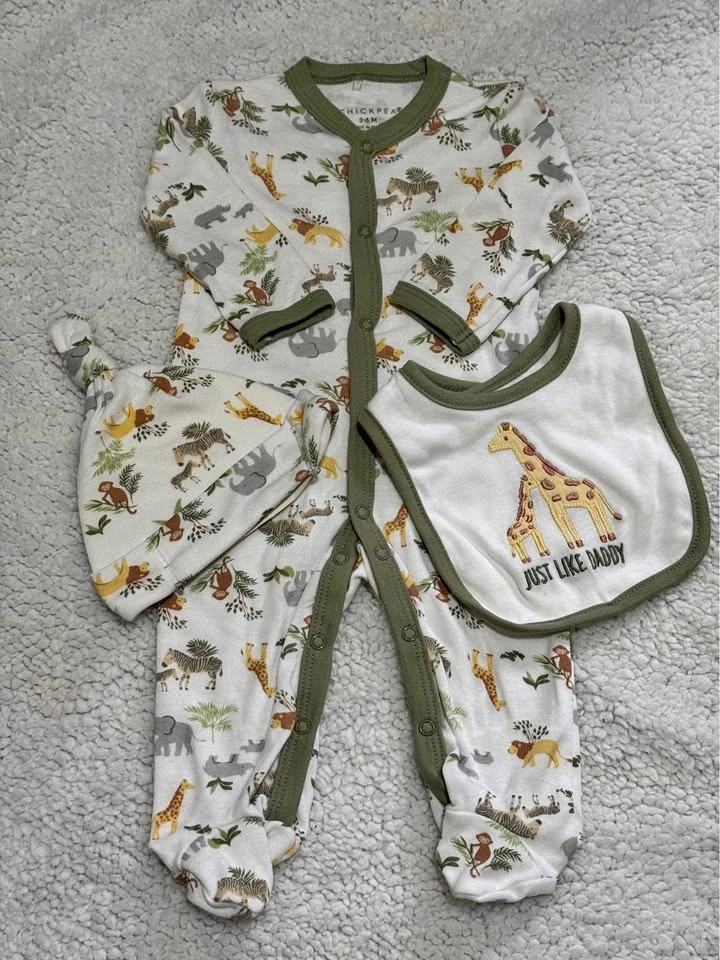 10Brand new adorable 3-piece baby clothing set (3–6 months). Comes with: • Soft full-sleeve footed onesie with jungle animal print • Matching hat • Bib with giraffe design and “Just Like Daddy” embroidery Perfect for gifting or daily wear! Size: 3–6 months Condition: Brand new, never used, never worn. Makes a lovely gift or a cute addition to your baby’s wardrobe. Pickup near L5R.