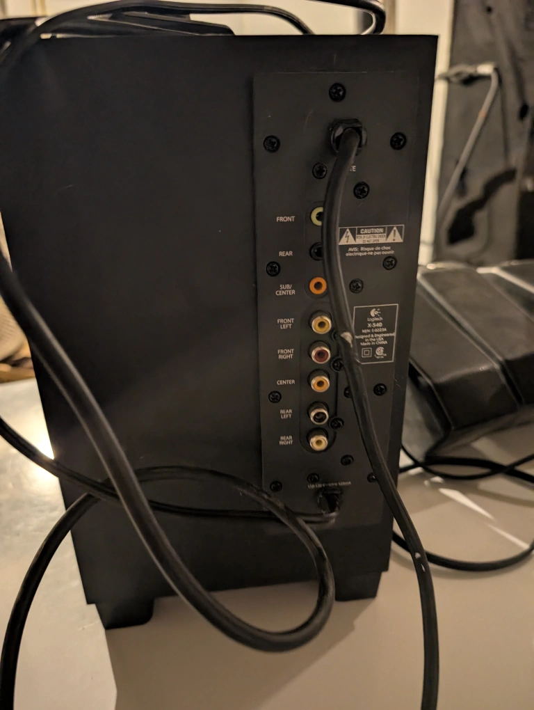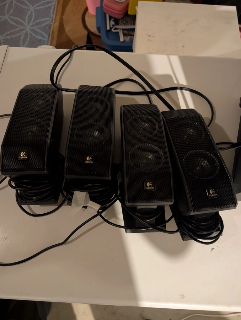Make offer Like new condition works perfectly little dusty don't use them comes with 4 speakers plus subwoofer . and Experience immersive audio Logitech S340 5.1 surround sound speaker system, perfect for enhancing your gaming, music, or movie experience. The system includes a subwoofer and five satellite speakers, delivering rich, clear sound throughout your space.