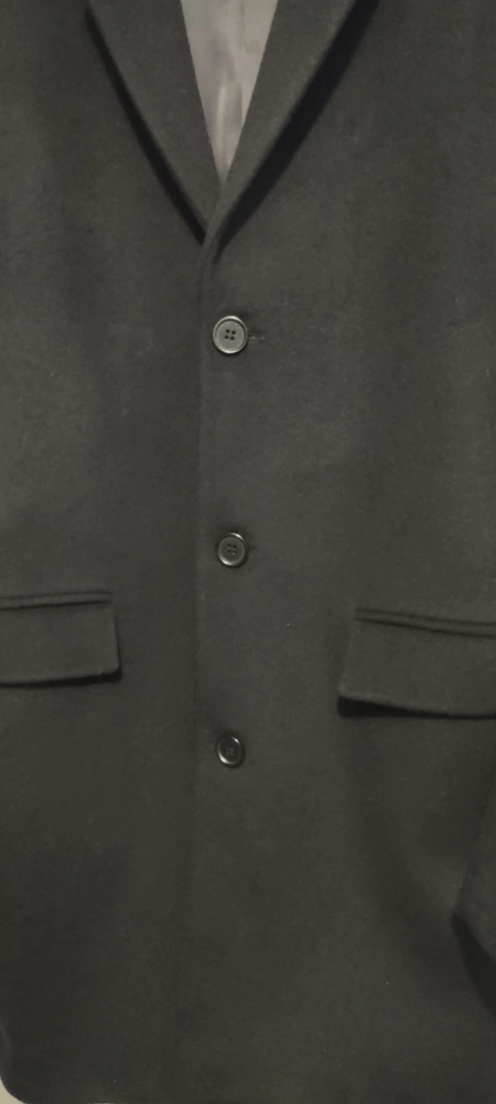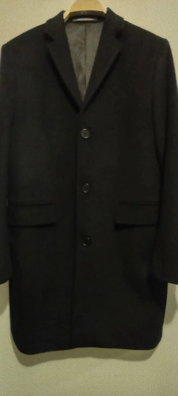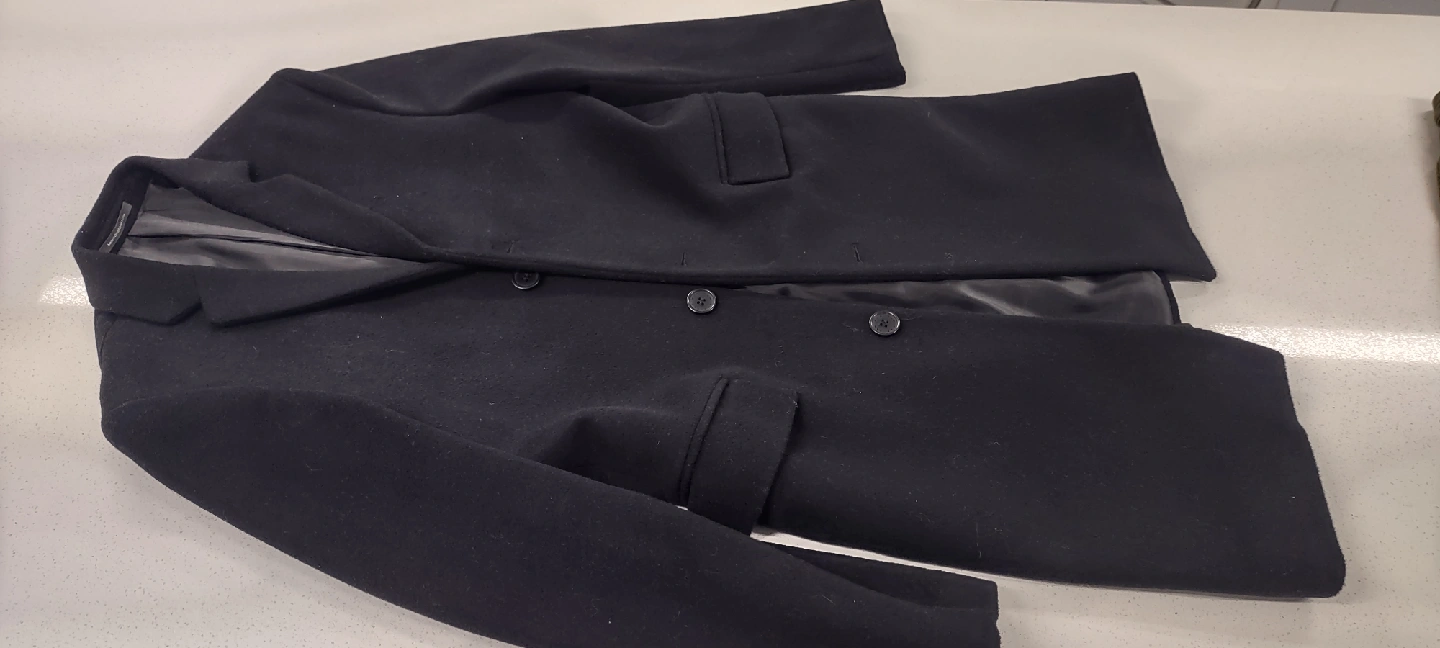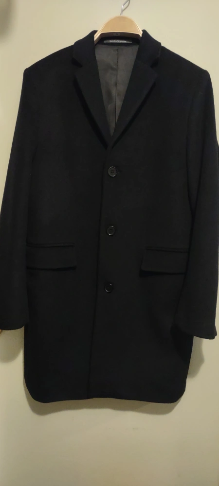 Selling a stylish black overcoat, perfect for the colder Canadian weather. It's a classic wool blend, ensuring both warmth and a sophisticated look. A versatile piece that can be dressed up or down! This design and material are perfect for wearing in this weather. It's a versatile design that goes well with both casual and formal wear. 3 buttons Total length from back neck to hem: 39 inches Total arm length: 25 Total chest width: 19