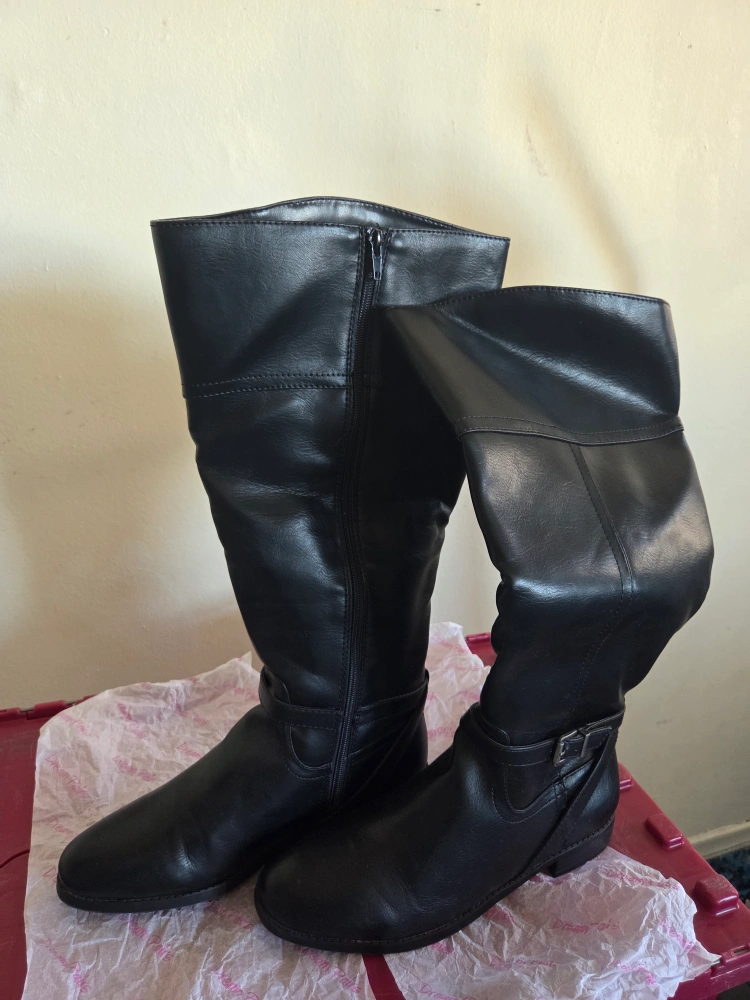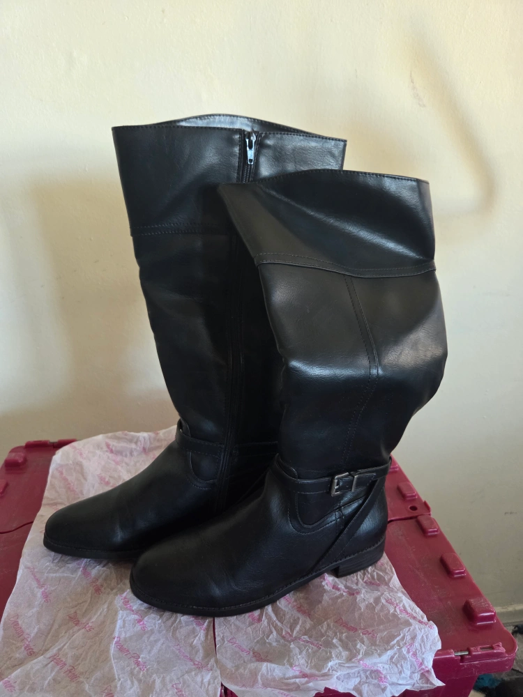 Selling a pair of knee-high boots in black. They feature a buckle detail and a zipper. Perfect for fall and winter!