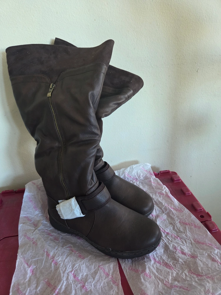 Selling a pair of brown knee-high boots from Dream Pairs. They feature a zip and buckle detail. They are in great condition!