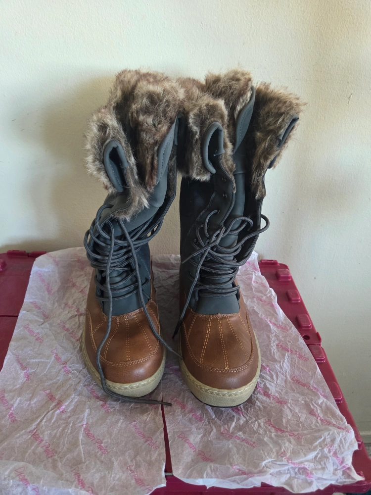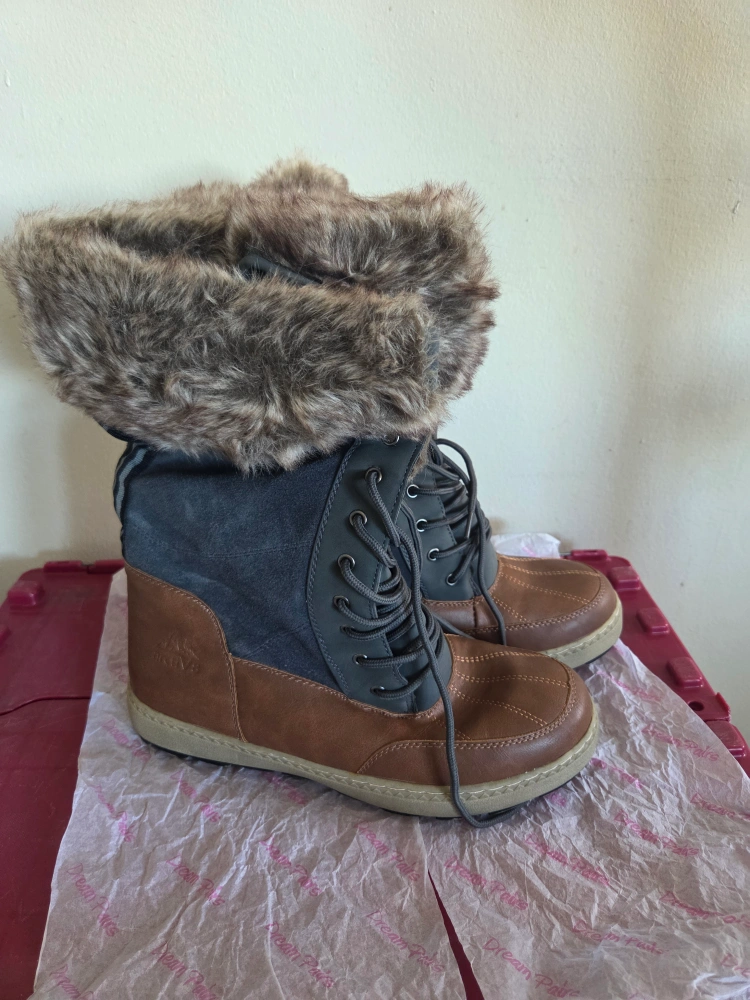 Cozy Arctic Trail winter boots ready for snowy days! These boots feature a stylish combination of brown and grey, with a faux fur trim for extra warmth and flair. Perfect for keeping your feet snug and dry during the colder months