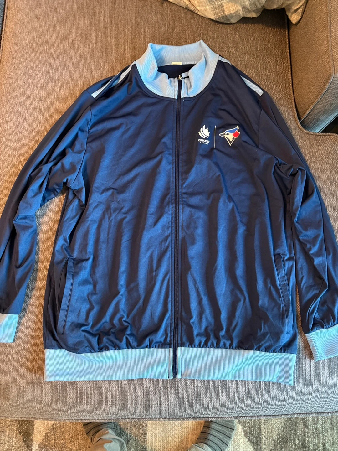 Selling a Toronto Blue Jays jacket with the Cricket Canada logo. It's a navy blue colour with light blue accents. Great for showing your support for both the Blue Jays and Cricket Canada!