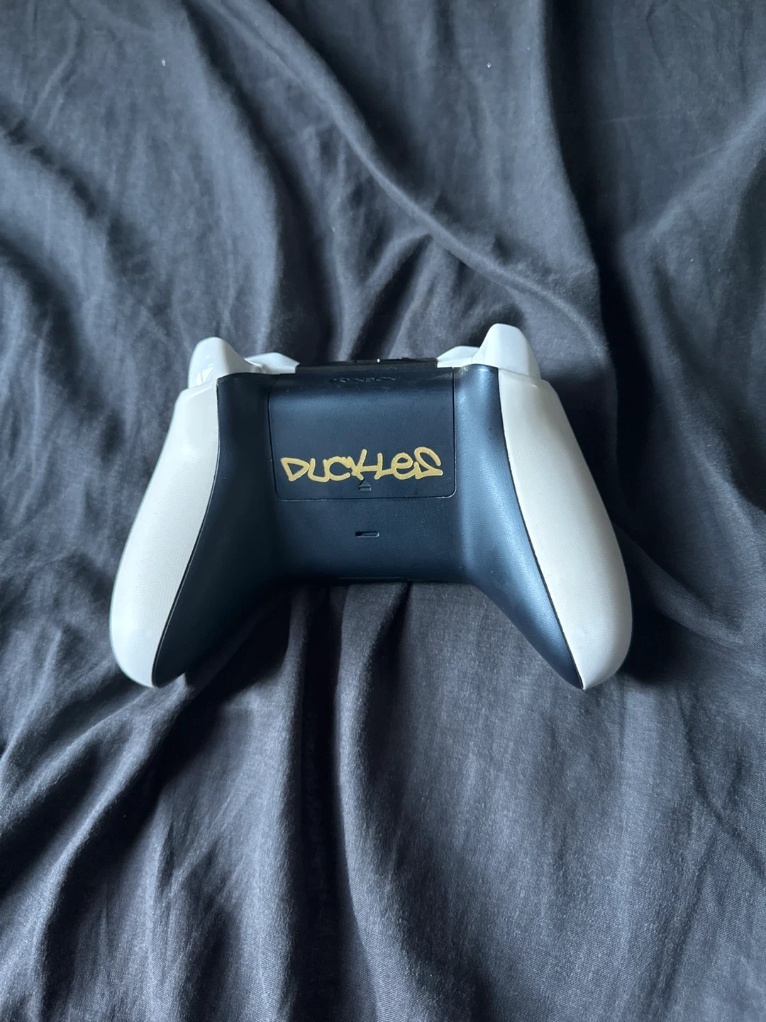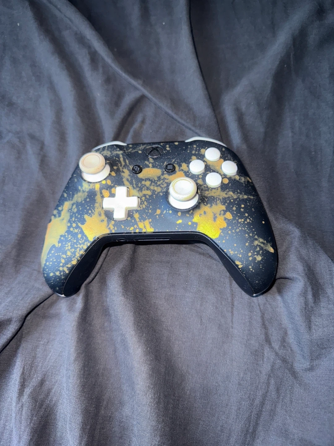 Selling a custom Xbox one controller. It has a unique design with gold accents. Great for a kid getting into games. Works with a cord or batteries. (Not included)