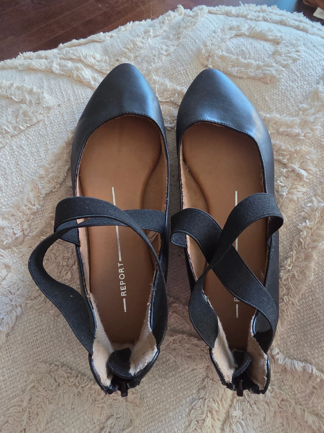 277Black ballet flats from Report. They feature a stylish elastic strap design and zipper back for a secure fit and a sleek, minimalist look. Perfect for everyday wear!