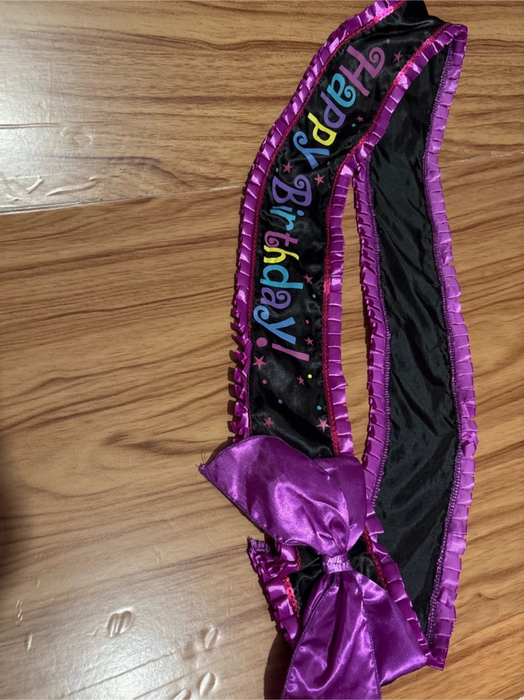Celebrate in style with this fun and festive Happy Birthday sash! It features a black background with colourful lettering and a purple bow. This sash is in good condition and ready to make someone's birthday extra special.