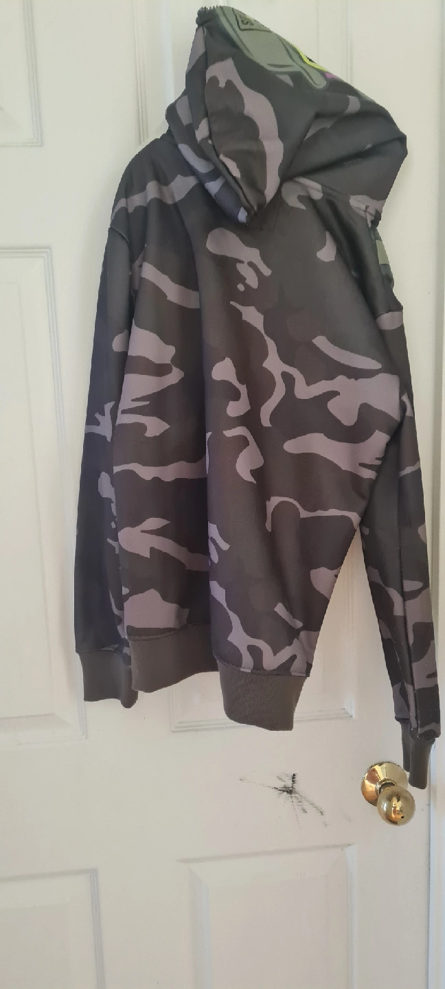 Selling a Splatoon 2 zip-up hoodie with a cool camo design! It features colourful ink splatters and a unique pattern on the hood. Perfect for any Splatoon fan! size Medium