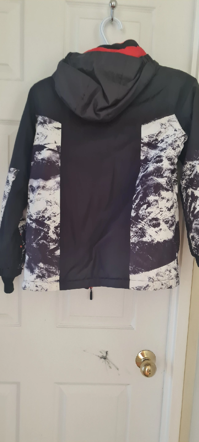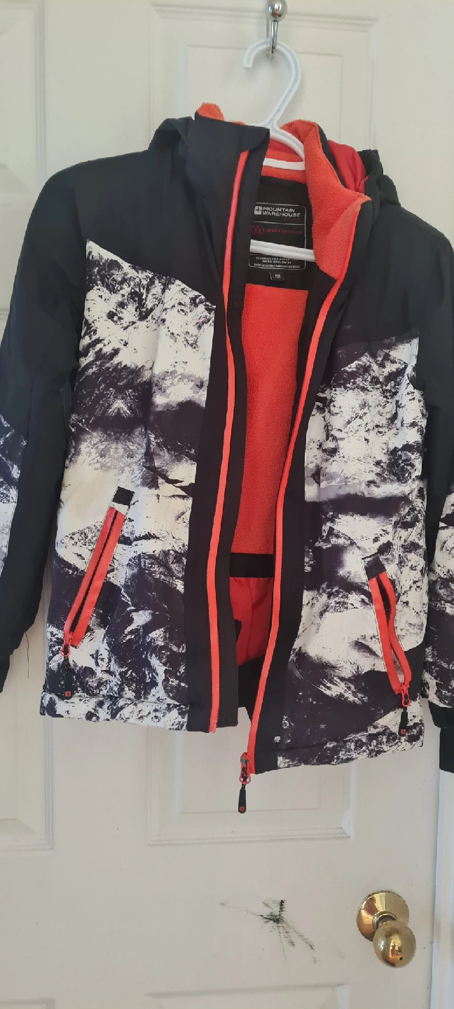 Kids ski jacket from Mountain Warehouse, size 7/8. It's in great condition and perfect for hitting the slopes or just staying warm this winter! The jacket features a stylish design with black, white, and orange accents.