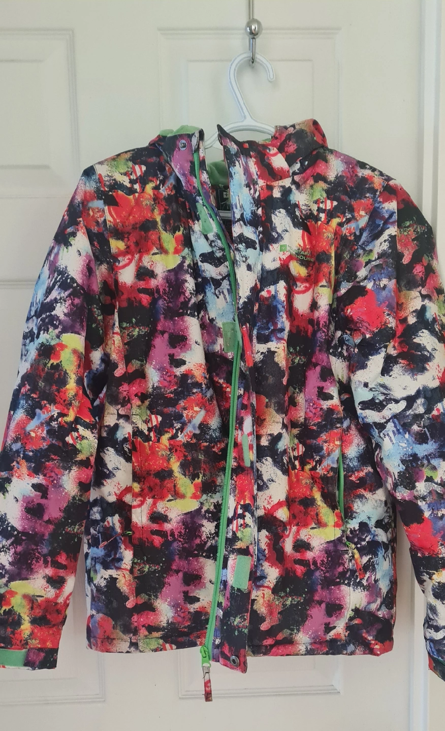 Selling a colourful snow jacket! It's in great condition and ready for the slopes. The jacket features a unique design with a mix of red, blue, purple, and white. Perfect for staying warm and stylish during winter activities