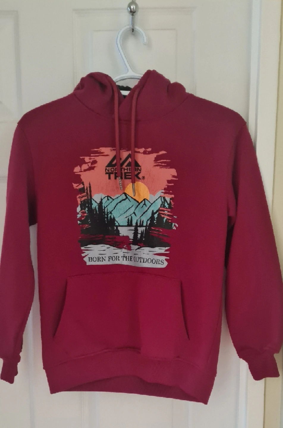 Cozy burgundy hoodie from Northern Threads! It's in great shape and features a cool outdoor-themed graphic on the front. Perfect for staying warm and stylish.