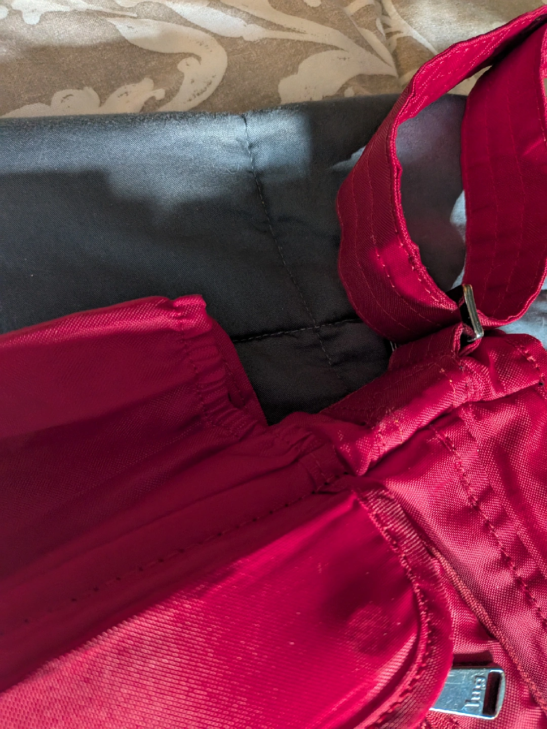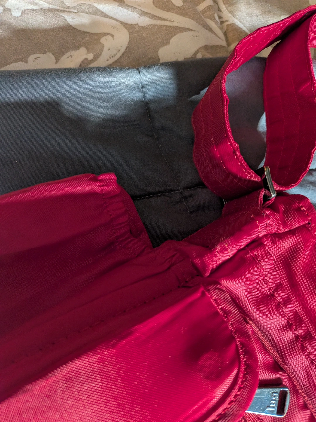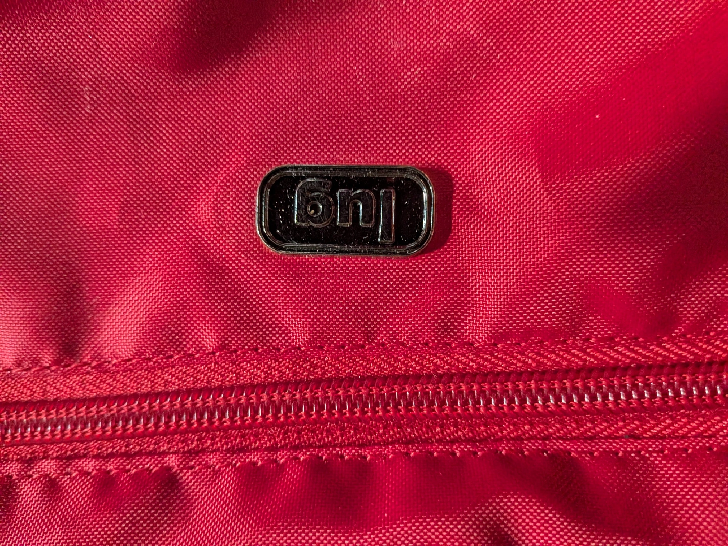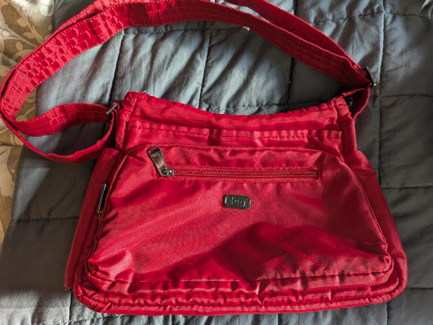 This is a Lug Infinity Collection Shimmy shoulder bag in a vibrant red colour. It's great for everyday use or travel. The bag features multiple compartments to keep your belongings organized. It's in good condition and ready for a new home!