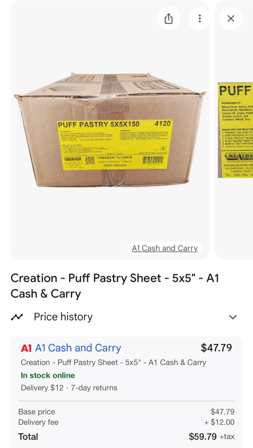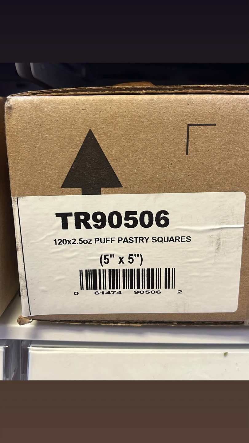 Selling puff pastry squares, each 5" x 5". Great for making delicious treats at home. They come in a box with 120 squares, each 2.5oz. Originally bought for $47.79.